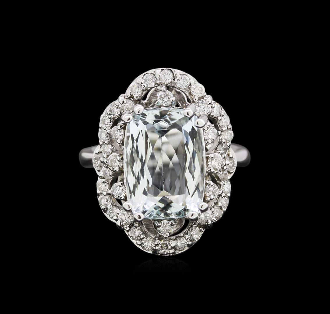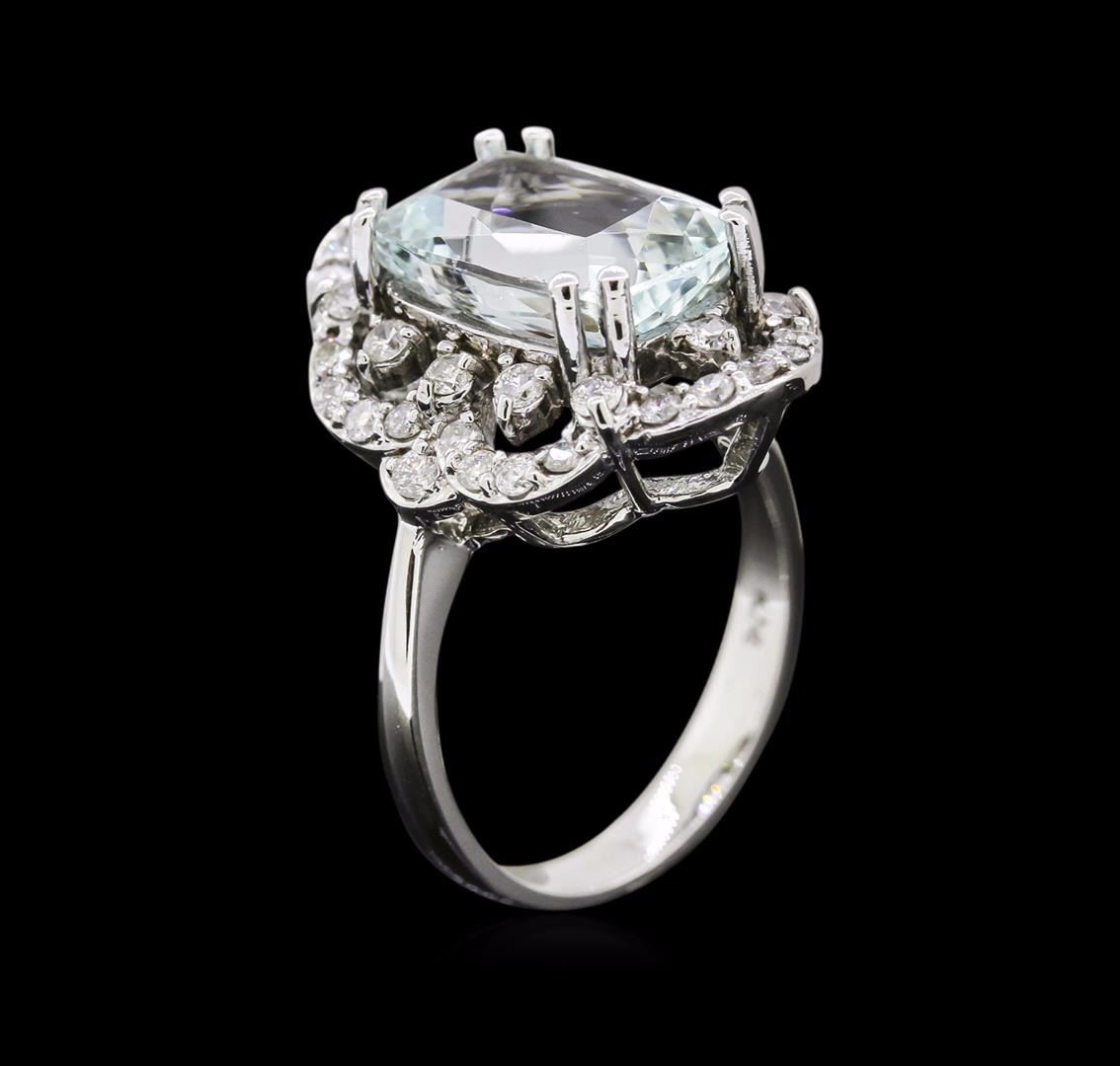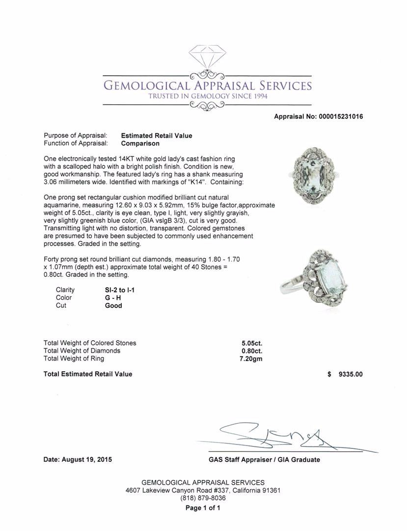 One electronically tested 14KT white gold lady's cast fashion ring with a scalloped halo with a bright polish finish. The featured lady's ring has a shank measuring 3.06 millimeters wide. Identified with markings of "K14". Condition is new, good workmanship. Containing: One prong set rectangular cushion modified brilliant cut natural aquamarine, measuring 12.60 x 9.03 x 5.92mm, 15% bulge factor, approximate weight of 5.05ct., clarity is eye clean, type I, light, very slightly grayish, very slightly greenish blue color, (GIA vslgB 3/3), cut is very good. Transmitting light with no distortion, transparent. Colored gemstones are presumed to have been subjected to commonly used enhancement processes. Graded in the setting. Forty prong set round brilliant cut diamonds, measuring 1.80 - 1.70 x 1.07mm (depth est.) approximate total weight of 40 Stones = 0.80ct. Graded in the setting. Clarity: SI-2 to I-1. Color: G - Good. Total Weight of Colored Stones 5.05ct. Total Weight of Diamonds 0.80ct. Total Weight of Ring 7.20gm. GAS Appraised at $9,335.00.