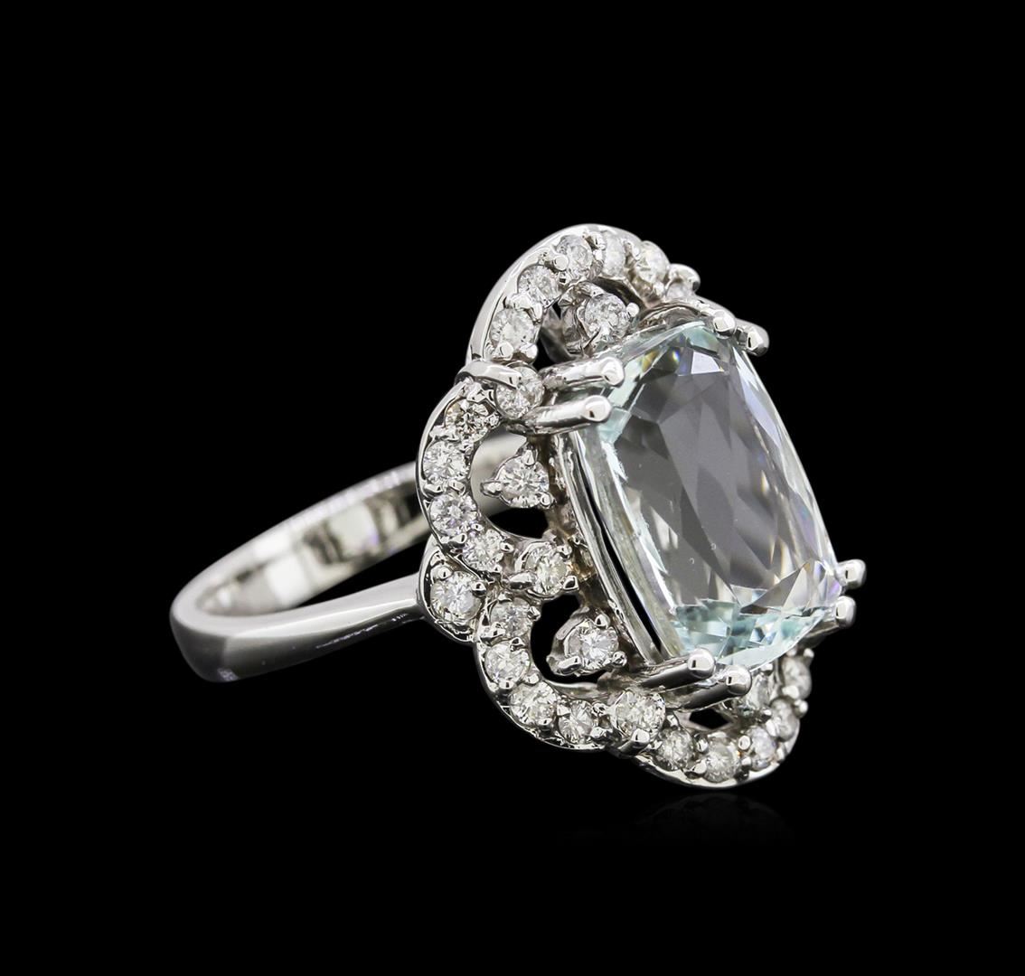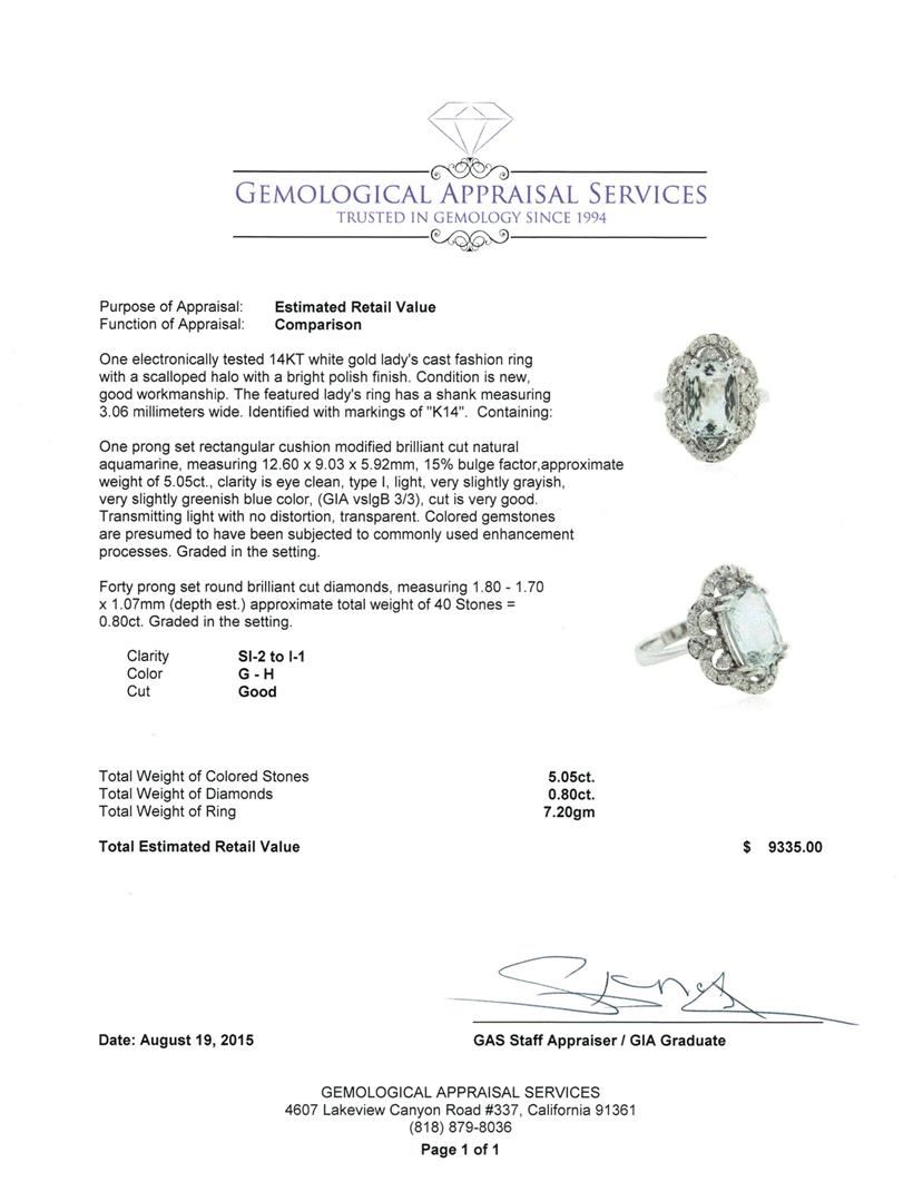 One electronically tested 14KT white gold lady's cast fashion ring with a scalloped halo with a bright polish finish. The featured lady's ring has a shank measuring 3.06 millimeters wide. Identified with markings of "K14". Condition is new, good workmanship. Containing: One prong set rectangular cushion modified brilliant cut natural aquamarine, measuring 12.60 x 9.03 x 5.92mm, 15% bulge factor, approximate weight of 5.05ct., clarity is eye clean, type I, light, very slightly grayish, very slightly greenish blue color, (GIA vslgB 3/3), cut is very good. Transmitting light with no distortion, transparent. Colored gemstones are presumed to have been subjected to commonly used enhancement processes. Graded in the setting. Forty prong set round brilliant cut diamonds, measuring 1.80 - 1.70 x 1.07mm (depth est.) approximate total weight of 40 Stones = 0.80ct. Graded in the setting. Clarity: SI-2 to I-1. Color: G - Good. Total Weight of Colored Stones 5.05ct. Total Weight of Diamonds 0.80ct. Total Weight of Ring 7.20gm. GAS Appraised at $9,335.00.