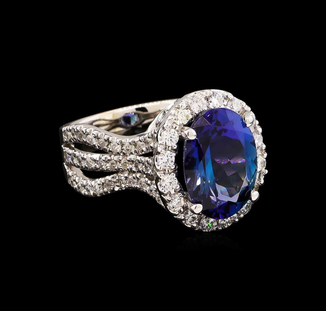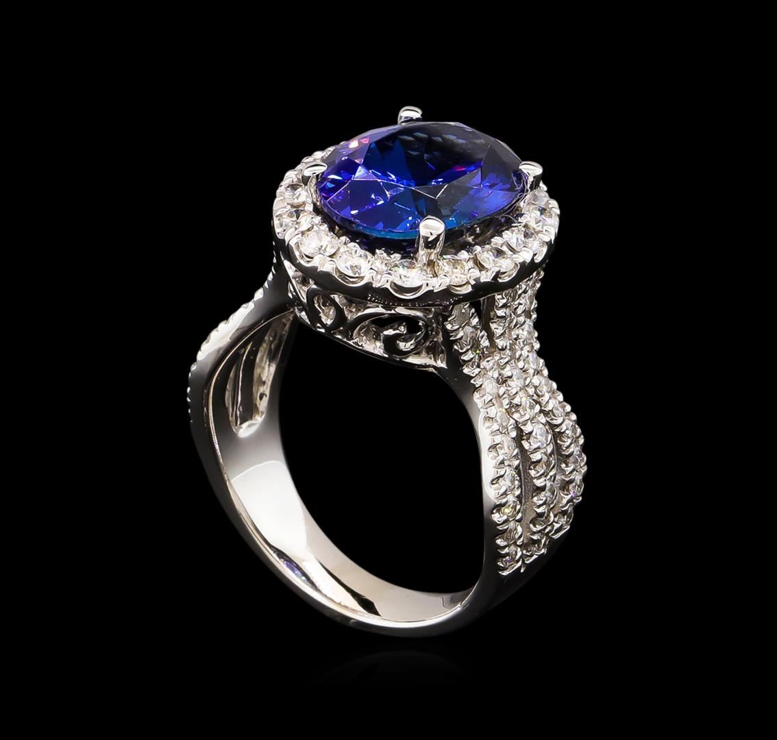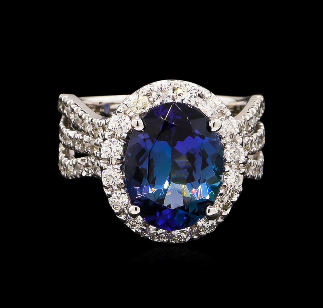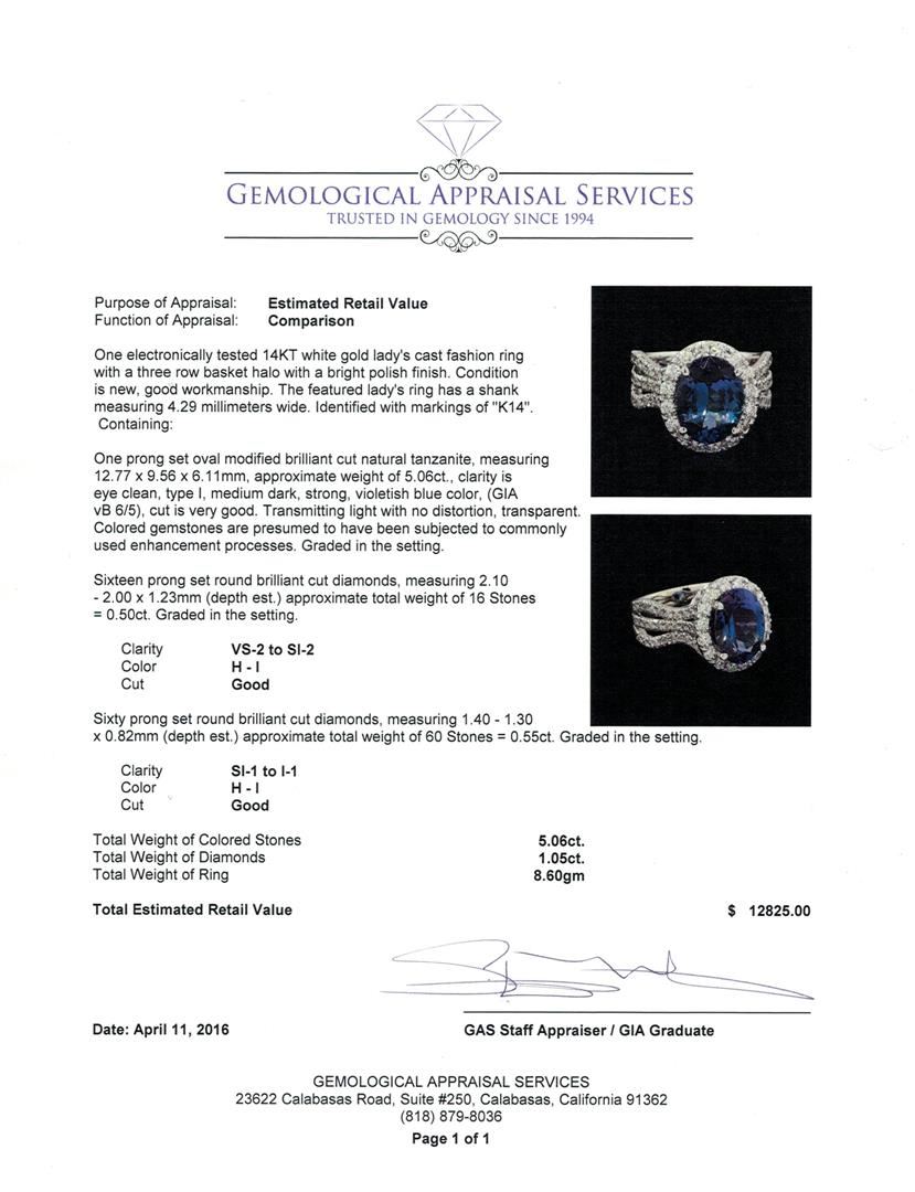 One electronically tested 14KT white gold lady's cast fashion ring with a three row basket halo with a bright polish finish. The featured lady's ring has a shank measuring 4.29 millimeters wide. Identified with markings of "K14". Condition is new, good workmanship. Containing: One prong set oval modified brilliant cut natural tanzanite, measuring 12.77 x 9.56 x 6.11mm, approximate weight of 5.06ct., clarity is eye clean, type I, medium dark, strong, violetish blue color, (GIA vB 6/5), cut is very good. Transmitting light with no distortion, transparent. Colored gemstones are presumed to have been subjected to commonly used enhancement processes. Graded in the setting. Sixteen prong set round brilliant cut diamonds, measuring 2.10 - 2.00 x 1.23mm (depth est.) approximate total weight of 16 Stones = 0.50ct. Graded in the setting. Clarity: VS-2 to SI-2. Color: H - I. Cut Good Sixty prong set round brilliant cut diamonds, measuring 1.40 - 1.30 x 0.82mm (depth est.) approximate total weight of 60 Stones = 0.55ct. Graded in the setting. Clarity: SI-1 to I-1. Color: H - I. Cut Good. Total Weight of Colored Stones 5.06ct. Total Weight of Diamonds 1.05ct. Total Weight of Ring 8.60gm. GAS Appraised at $12,825.00.