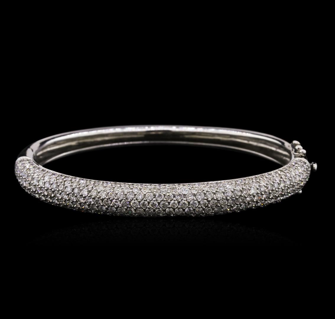 One electronically tested 14KT white gold lady's combination cast & assembled fashion hinged cuff bangle bracelet with a tongue clasp with foldover safety with a bright polish finish. The featured lady's bracelet measures approximately 7 inches in length. Identified with markings of "14K". Condition is like new, good workmanship. Containing: Two Hundred Ninety-Six prong set round brilliant cut diamonds, measuring 1.70 - 1.65 x 1.01mm (depth est.) approximate total weight of 296 Stones = 5.10ct. Graded in the setting. Clarity: SI-1 to I-1. Color: H - I. Cut Good. Total Weight of Diamonds 5.10ct. Total Weight of Hinged Cuff Bangle Bracelet 22.00gm. GAS Appraised at $15,005.00.