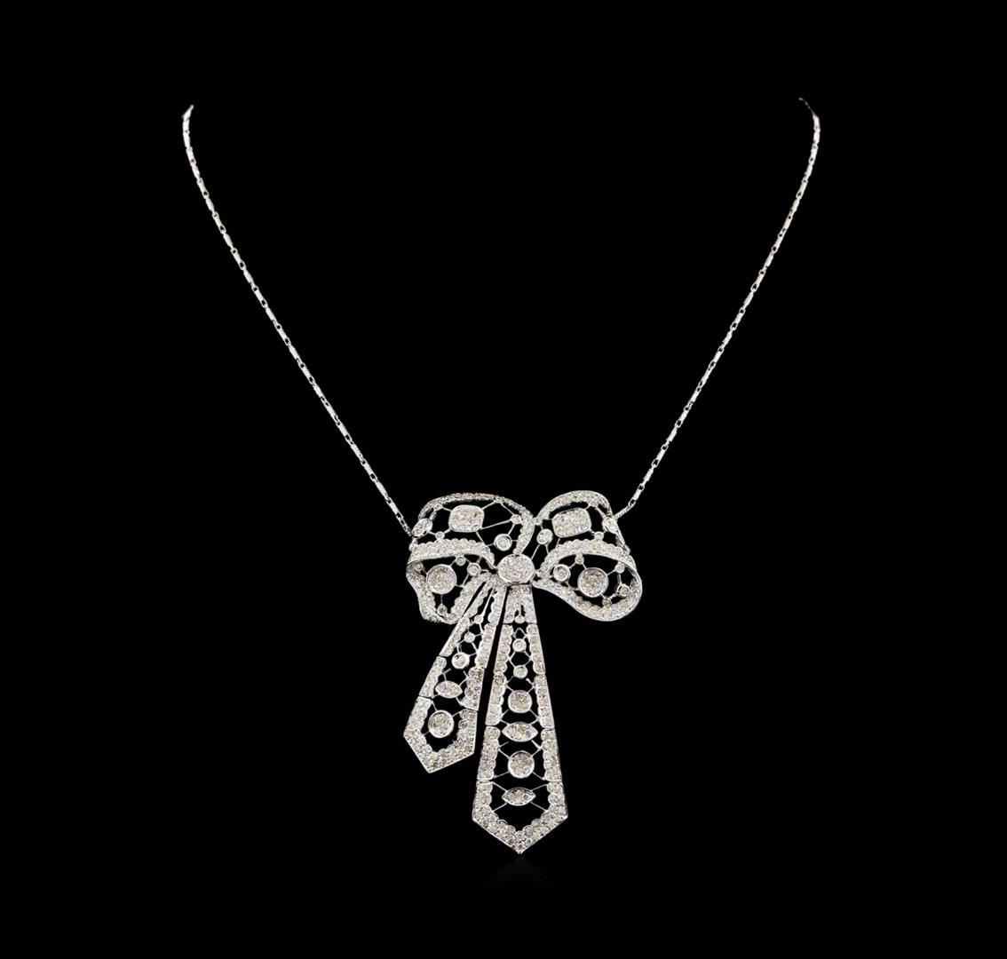 One electronically tested 14KT white gold ladies cast & assembled diamond bow brooch with a bright polish finish. The brooch features a flexible stylized diamond set bow design, completed by a horizontally place pin. Area measurements are 3.00 x 2.00 inches. Condition is good. Containing: Four Hundred Six bead set round brilliant cut diamonds, measuring 1.60 - 1.40 x 0.90mm (depth est.) approximate total weight of 406 Stones = 5.10ct. Graded in the setting. Clarity: I-1 to I-3. Color: J - L. Total Weight of Diamonds 5.10ct. Total Weight of Brooch 20.52gm. AIG Appraised at $13,990.00.