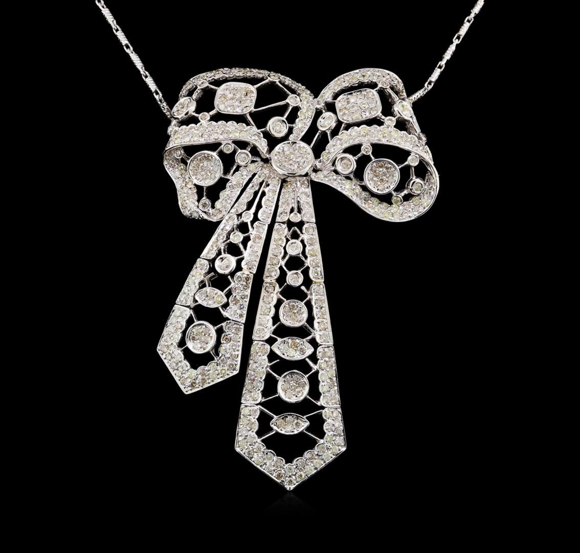 One electronically tested 14KT white gold ladies cast & assembled diamond bow brooch with a bright polish finish. The brooch features a flexible stylized diamond set bow design, completed by a horizontally place pin. Area measurements are 3.00 x 2.00 inches. Condition is good. Containing: Four Hundred Six bead set round brilliant cut diamonds, measuring 1.60 - 1.40 x 0.90mm (depth est.) approximate total weight of 406 Stones = 5.10ct. Graded in the setting. Clarity: I-1 to I-3. Color: J - L. Total Weight of Diamonds 5.10ct. Total Weight of Brooch 20.52gm. AIG Appraised at $13,990.00.