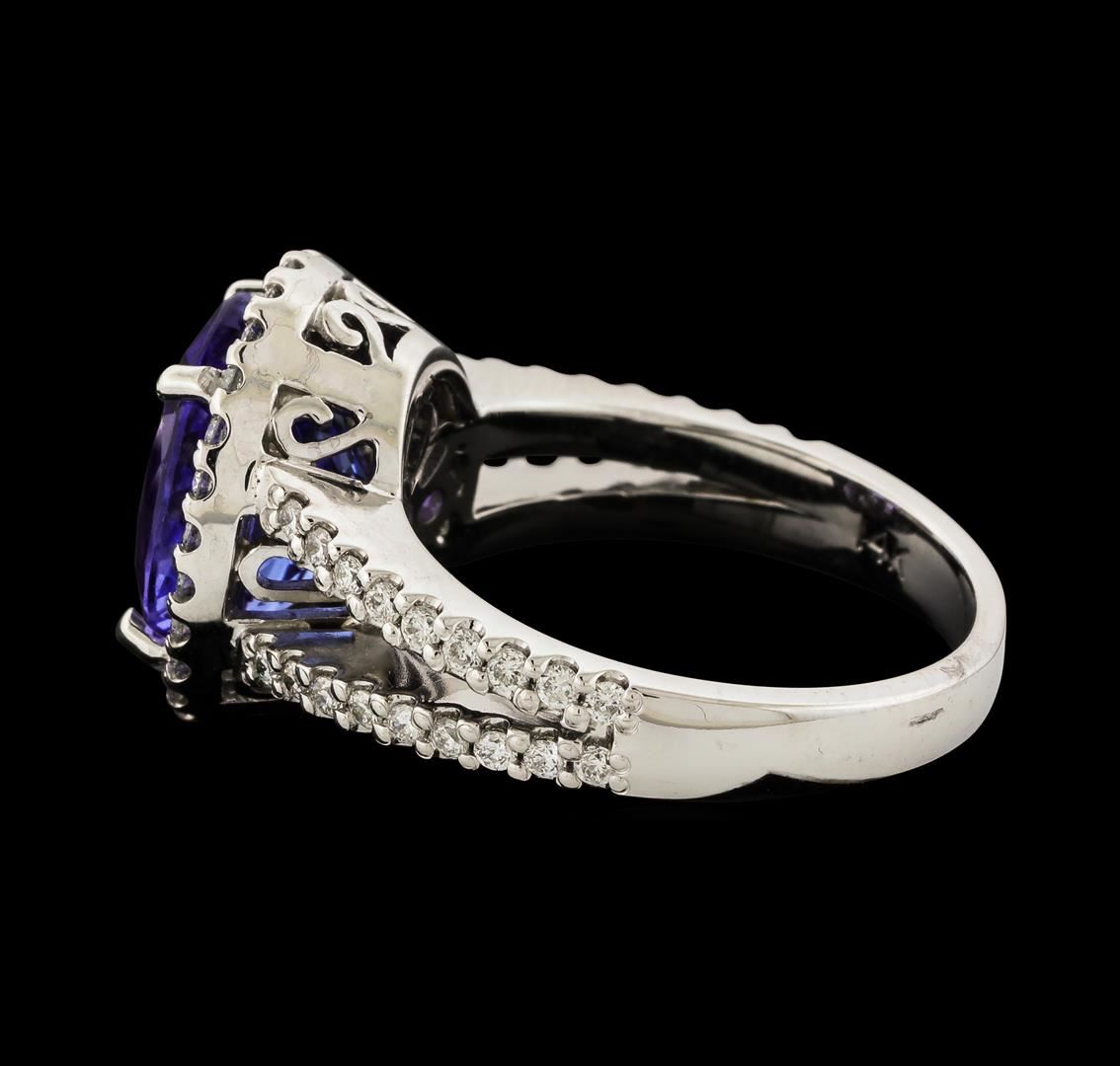 One electronically tested 14KT white gold lady's cast fashion ring with a split shank basket halo with a bright polish finish. The featured lady's ring has a shank measuring 2.92 millimeters wide. Identified with markings of '14K'. Condition is new, good workmanship. Containing: One prong set oval modified brilliant cut natural tanzanite, measuring 11.58 x 9.46 x 6.58mm, (depth est.) approximate weight of 5.10ct., clarity is eye clean, medium, very slightly grayish, violet color, (GIA V 5/3), cut is very good. Transmitting light with no distortion, transparent. Colored gemstones are presumed to have been subjected to commonly used enhancement processes. Graded in the setting. Sixty-Two prong set round brilliant cut diamonds, measuring 1.40 - 1.35 x 0.86mm (depth est.) approximate total weight of 62 Stones = 0.61ct. Graded in the setting. Clarity SI-1 to SI-2. Color: G - H Cut Good. Total Weight of Colored Stones 5.10ct.. Total Weight of Diamonds 0.61ct.. Total Weight of Ring 8.20gm GAS Appraised at $8,255.00.