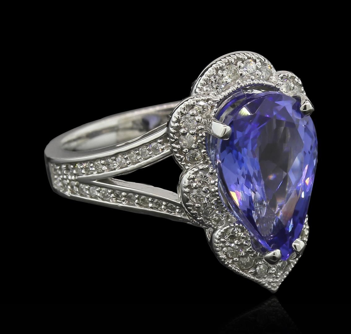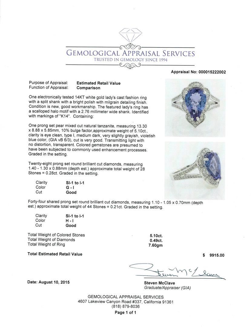 One electronically tested 14KT white gold lady's cast fashion ring with a split shank with a bright polish with milgrain detailing finish. The featured lady's ring has a scalloped halo motif with a 2.76 millimeter wide shank. Identified with markings of "K14". Condition is new, good workmanship. Containing: One prong set pear mixed cut natural tanzanite, measuring 13.30 x 8.88 x 5.85mm, 10% bulge factor, approximate weight of 5.10ct., clarity is eye clean, type I, medium dark, very slightly grayish, violetish blue color, (GIA vB 6/3), cut is very good. Transmitting light with no distortion, transparent. Colored gemstones are presumed to have been subjected to commonly used enhancement processes. Graded in the setting. Twenty-Eight prong set round brilliant cut diamonds, measuring 1.40 - 1.30 x 0.88mm (depth est.) approximate total weight of 28 Stones = 0.28ct. Graded in the setting. Clarity: SI-1 to I-1. Color: G - I. Cut Good Forty-Four shared prong set round brilliant cut diamonds, measuring 1.10 - 1.05 x 0.70mm (depth est.) approximate total weight of 44 Stones = 0.21ct. Graded in the setting. Clarity: SI-1 to I-1. Color: H - I. Cut Good. Total Weight of Colored Stones 5.10ct. Total Weight of Diamonds 0.49ct. Total Weight of Ring 7.60gm. GAS Appraised at $9,915.00.