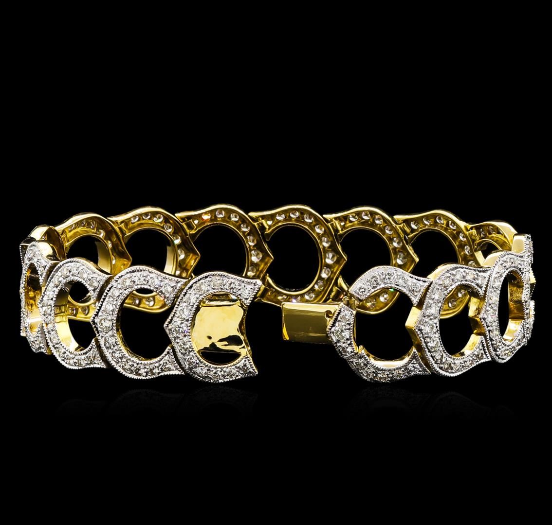 One electronically tested 18KT yellow gold lady's combination cast & assembled fashion bracelet with a tongue clasp with a bright polish with milgrain detailing finish. The featured lady's bracelet has custom links with a "C" motif and measures 7 inches in length with a width of 12 millimeters. Identified with markings of "18K 750". Condition is new, good workmanship. Containing: Two Hundred Eight bead set round brilliant cut diamonds, measuring 2.10 - 1.65 x 1.15mm (depth est.) approximate total weight of 208 Stones = 5.11ct. Graded in the setting. Clarity: VS-1 to SI-1. Color: F - Very Good. Total Weight of Diamonds 5.11ct. Total Weight of Bracelet 34.00gm. GAS Appraised at $23,255.00.