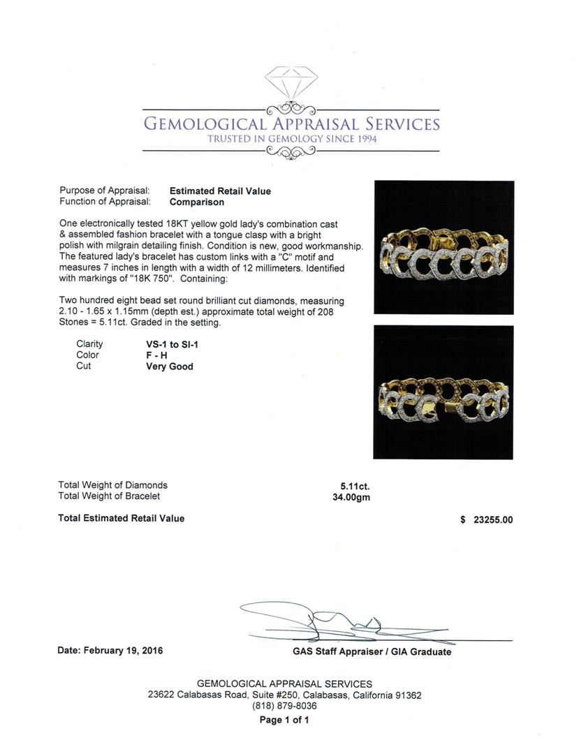 One electronically tested 18KT yellow gold lady's combination cast & assembled fashion bracelet with a tongue clasp with a bright polish with milgrain detailing finish. The featured lady's bracelet has custom links with a "C" motif and measures 7 inches in length with a width of 12 millimeters. Identified with markings of "18K 750". Condition is new, good workmanship. Containing: Two Hundred Eight bead set round brilliant cut diamonds, measuring 2.10 - 1.65 x 1.15mm (depth est.) approximate total weight of 208 Stones = 5.11ct. Graded in the setting. Clarity: VS-1 to SI-1. Color: F - Very Good. Total Weight of Diamonds 5.11ct. Total Weight of Bracelet 34.00gm. GAS Appraised at $23,255.00.
