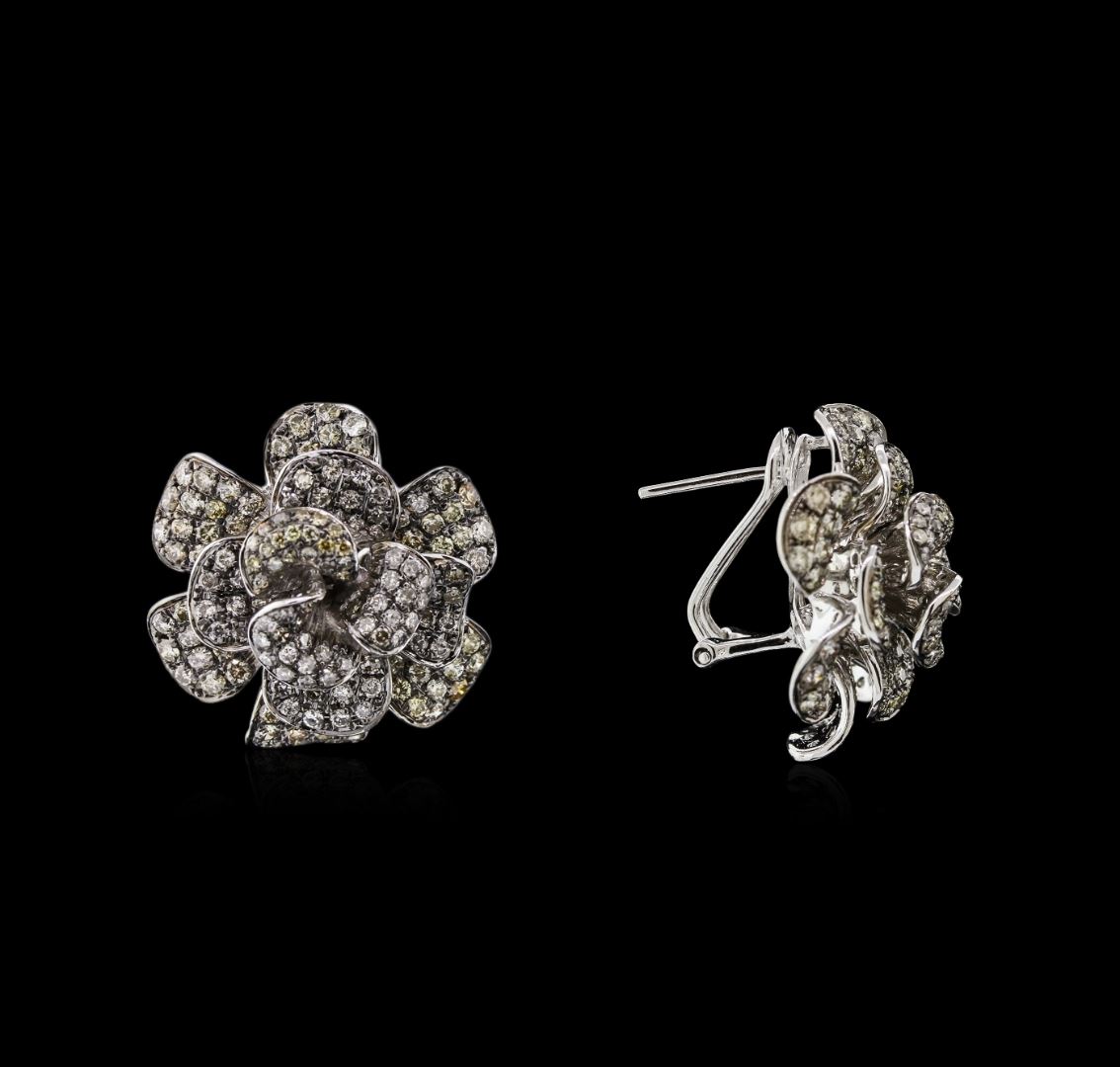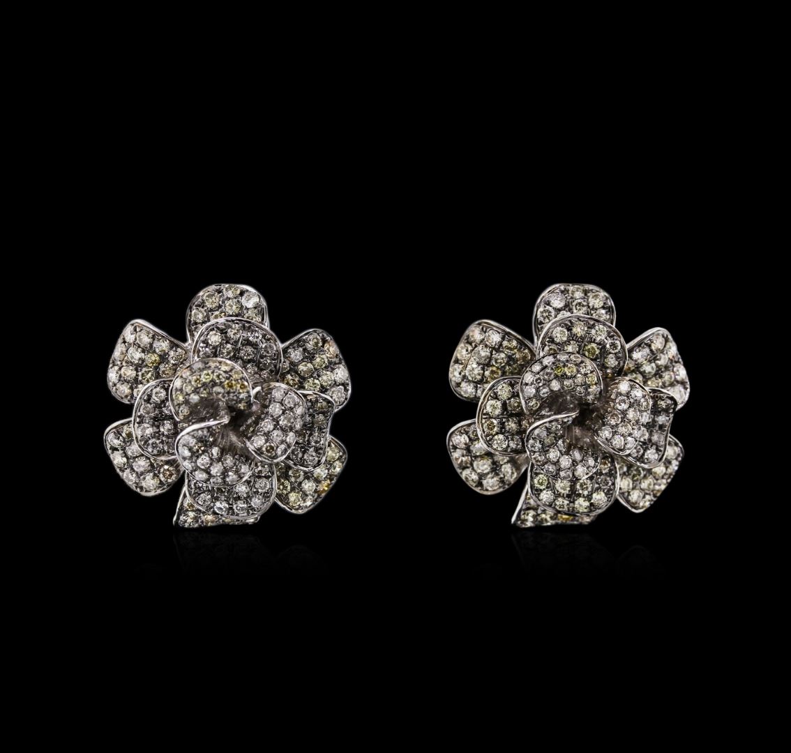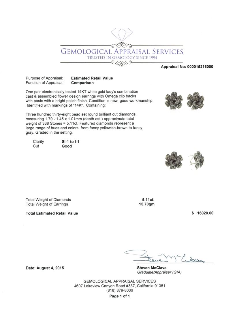 One pair electronically tested 14KT white gold lady's combination cast & assembled flower design earring with Omega clip backs with posts with a bright polish finish. Identified with markings of "14K". Condition is new, good workmanship. Containing: Three Hundred Thirty-Eight bead set round brilliant cut diamonds, measuring 1.70 - 1.45 x 1.01mm (depth est.) approximate total weight of 338 Stones = 5.11ct. Featured diamonds represent a large range of hues and colors, from fancy yellowish-brown to fancy gray. Graded in the setting. Clarity SI-1 to I-1 Cut Good Total Weight of Diamonds 5.11ct. Total Weight of Earring 15.70gm GAS Appraised at $16,020.00.