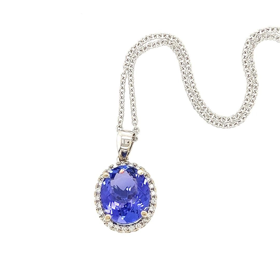 One electronically tested 14KT white gold lady's combination cast & assembled fashion pendant and chain 16.0" long, 1.5mm round cable link with a lobster claw clasp with a basket halo with a bright polish finish. Condition is new, good workmanship. The featured lady's pendant has a drop measuring approximately 22.5mm. Identified with markings of "14K". Containing: One prong set oval modified brilliant cut natural tanzanite, measuring 12.30 x 10.25 x 5.80mm, (depth est.) approximate weight of 5.12ct., clarity is eye clean, medium, moderately strong, bluish violet color, (GIA bV 5/4), cut is very good. Transmitting light with no distortion, transparent. Colored gemstones are presumed to have been subjected to commonly used enhancement processes. Graded in the setting. Twenty-five prong set round brilliant cut diamonds, measuring 1.30 - 1.25 x 0.77mm (depth est.) approximate total weight of 25 Stones = 0.19ct. Graded in the setting. Color H - I Clarity VS-2 to SI-1 Cut Very Good Total Weight of Colored Stones Total Weight of Diamonds Total Weight of Pendant And Chain 5.12ct. 0.19ct. 5.10gm Appraisal No: 000022197001 Total Estimated Retail Value $ 7860.00
