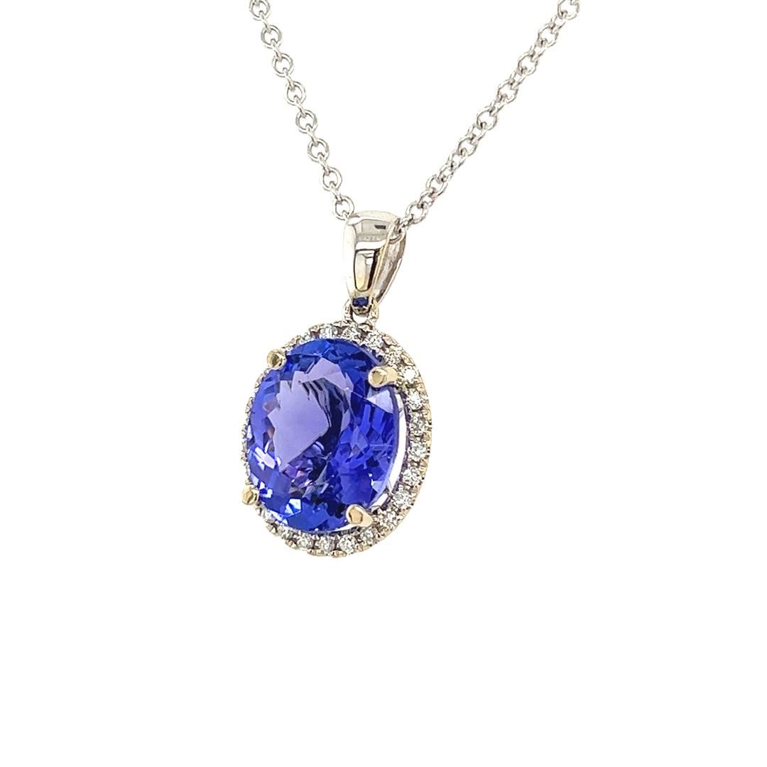 One electronically tested 14KT white gold lady's combination cast & assembled fashion pendant and chain 16.0" long, 1.5mm round cable link with a lobster claw clasp with a basket halo with a bright polish finish. Condition is new, good workmanship. The featured lady's pendant has a drop measuring approximately 22.5mm. Identified with markings of "14K". Containing: One prong set oval modified brilliant cut natural tanzanite, measuring 12.30 x 10.25 x 5.80mm, (depth est.) approximate weight of 5.12ct., clarity is eye clean, medium, moderately strong, bluish violet color, (GIA bV 5/4), cut is very good. Transmitting light with no distortion, transparent. Colored gemstones are presumed to have been subjected to commonly used enhancement processes. Graded in the setting. Twenty-five prong set round brilliant cut diamonds, measuring 1.30 - 1.25 x 0.77mm (depth est.) approximate total weight of 25 Stones = 0.19ct. Graded in the setting. Color H - I Clarity VS-2 to SI-1 Cut Very Good Total Weight of Colored Stones Total Weight of Diamonds Total Weight of Pendant And Chain 5.12ct. 0.19ct. 5.10gm Appraisal No: 000022197001 Total Estimated Retail Value $ 7860.00