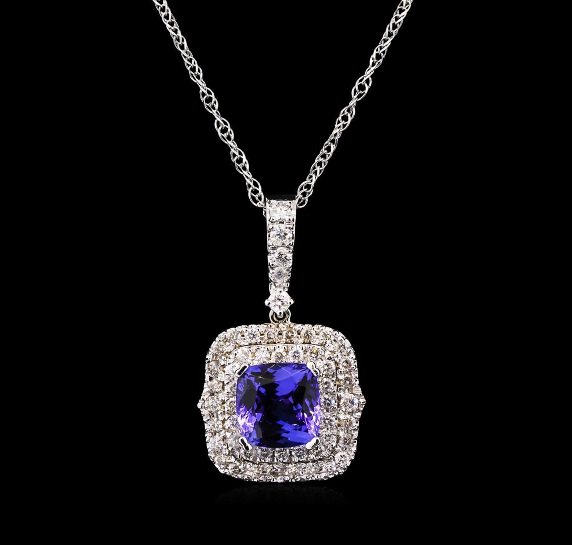 One electronically tested 14KT white gold lady's combination cast & assembled fashion pendant & chain 18.0" long, 1.7mm loose rope chain with a spring ring clasp with a bright polish finish. Identified with markings of "14K". Condition is new, good workmanship. Containing: One prong set square cushion modified brilliant cut natural tanzanite, measuring 9.90 x 9.65 x 6.45mm, 5% bulge factor, approximate weight of 5.12ct., clarity is eye clean, type I, medium, very slightly grayish, bluish violet color, (GIA bV 5/3), cut is good. Transmitting light with no distortion, transparent. Colored gemstones are presumed to have been subjected to commonly used enhancement processes. Graded in the setting. Seven split prong set round brilliant cut diamonds, measuring 2.50 - 2.45 x 1.49mm (depth est.) approximate total weight of 7 Stones = 0.40ct. Graded in the setting. Clarity: SI-2 to I-1. Color: H - I. Cut Good Forty-Four split prong set round brilliant cut diamonds, measuring 1.80 - 1.70 x 1.14mm (depth est.) approximate total weight of 44 Stones = 0.96ct. Graded in the setting. Clarity: SI-2 to I-1. Color: H - I. Cut Good. Total Weight of Colored Stones 5.12ct. Total Weight of Diamonds 1.36ct. Total Weight of Pendant & Chain 8.90gm. GAS Appraised at $10,580.00.
