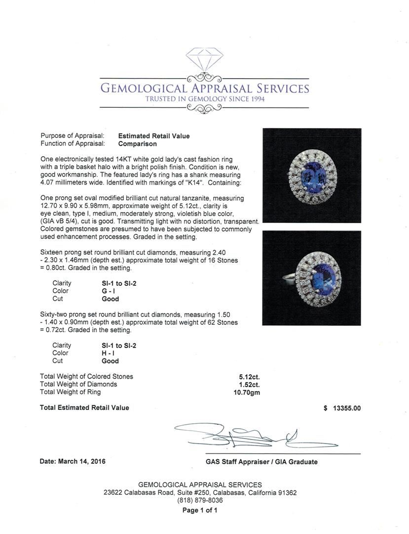 One electronically tested 14KT white gold lady's cast fashion ring with a triple basket halo with a bright polish finish. The featured lady's ring has a shank measuring 4.07 millimeters wide. Identified with markings of "K14". Condition is new, good workmanship. Containing: One prong set oval modified brilliant cut natural tanzanite, measuring 12.70 x 9.90 x 5.98mm, approximate weight of 5.12ct., clarity is eye clean, type I, medium, moderately strong, violetish blue color, (GIA vB 5/4), cut is good. Transmitting light with no distortion, transparent. Colored gemstones are presumed to have been subjected to commonly used enhancement processes. Graded in the setting. Sixteen prong set round brilliant cut diamonds, measuring 2.40 - 2.30 x 1.46mm (depth est.) approximate total weight of 16 Stones = 0.80ct. Graded in the setting. Clarity: SI-1 to SI-2. Color: G - I. Cut Good Sixty-Two prong set round brilliant cut diamonds, measuring 1.50 - 1.40 x 0.90mm (depth est.) approximate total weight of 62 Stones = 0.72ct. Graded in the setting. Clarity: SI-1 to SI-2. Color: H - I. Cut Good. Total Weight of Colored Stones 5.12ct. Total Weight of Diamonds 1.52ct. Total Weight of Ring 10.70gm. GAS Appraised at $13,355.00.