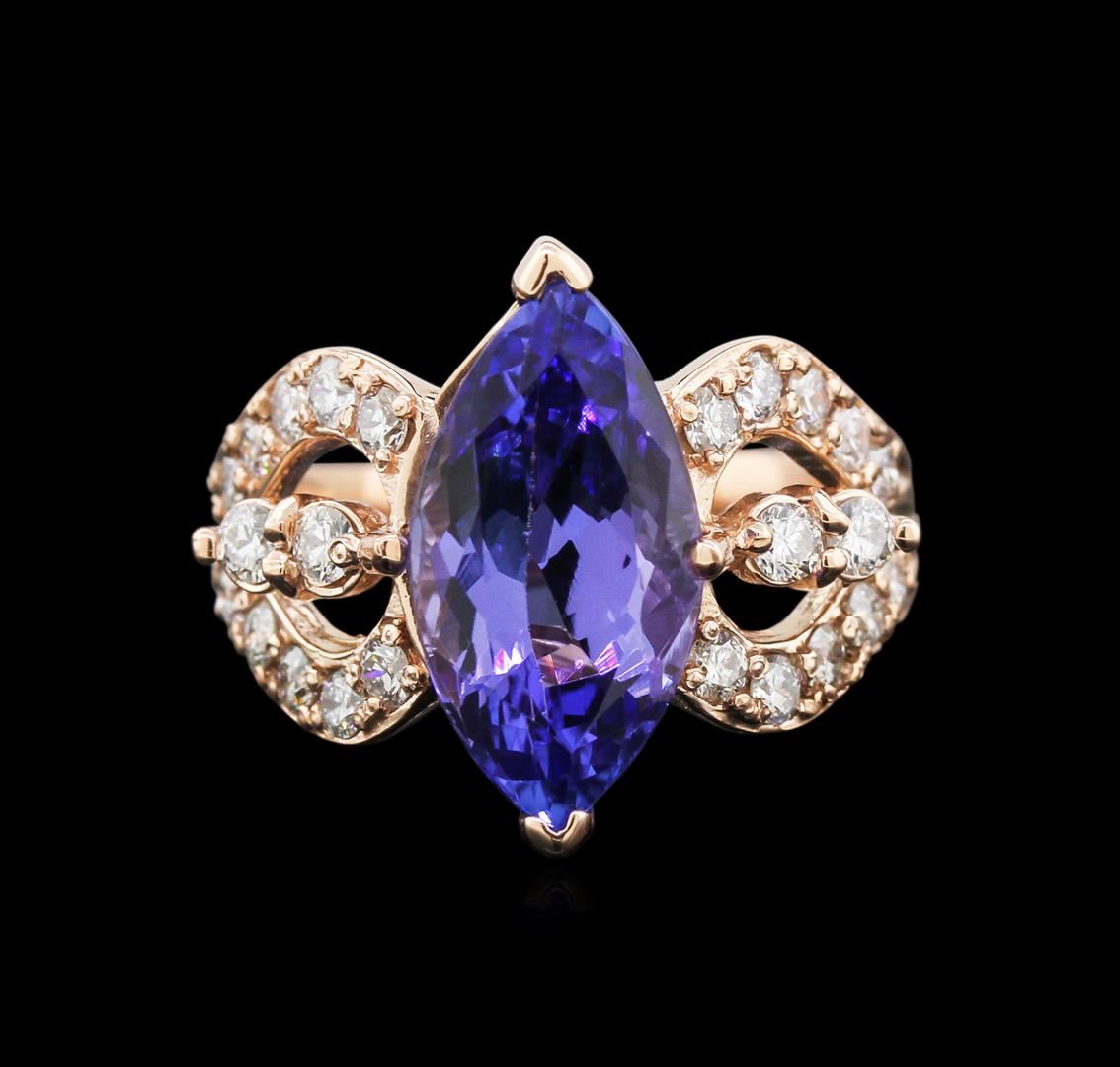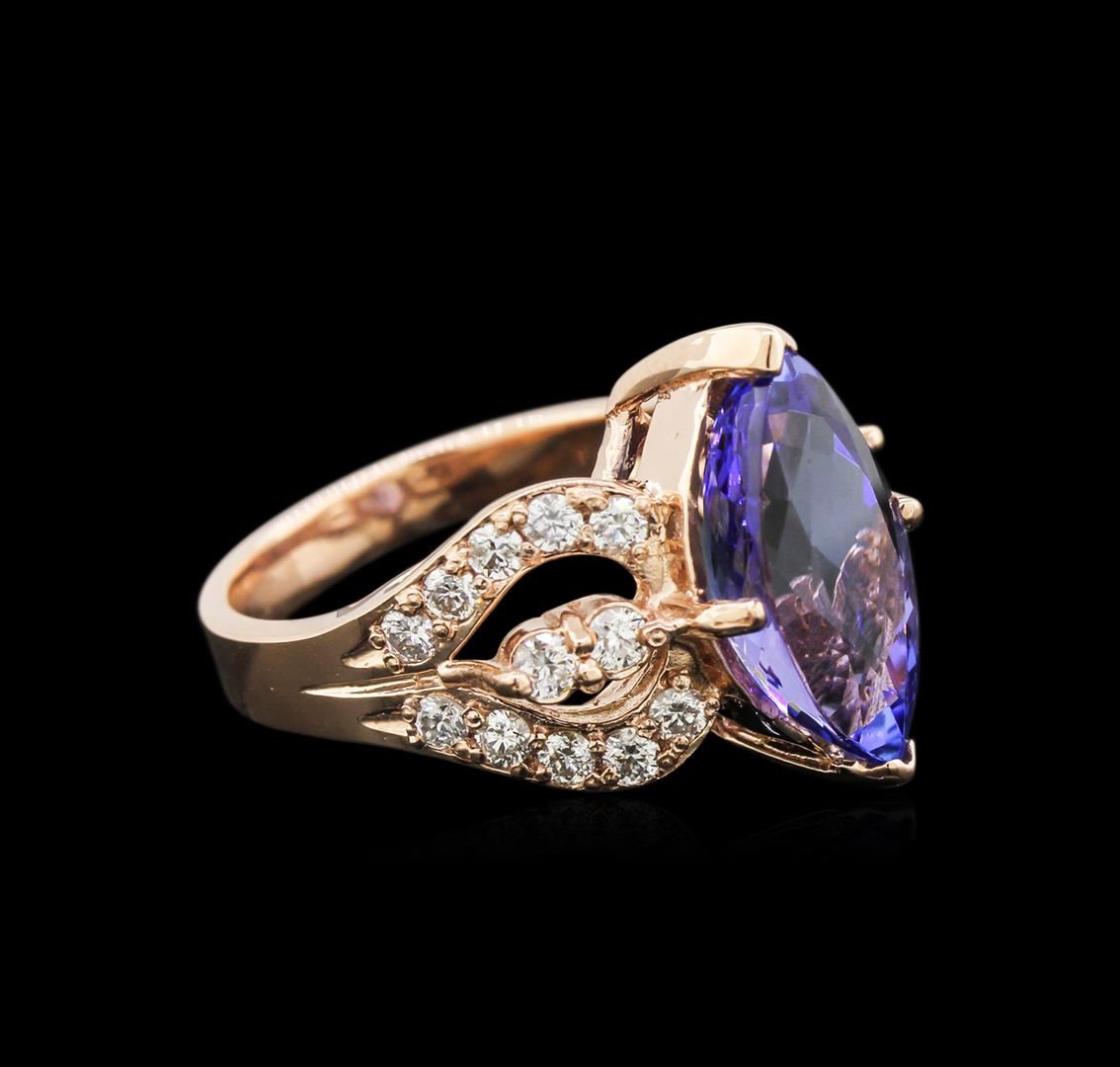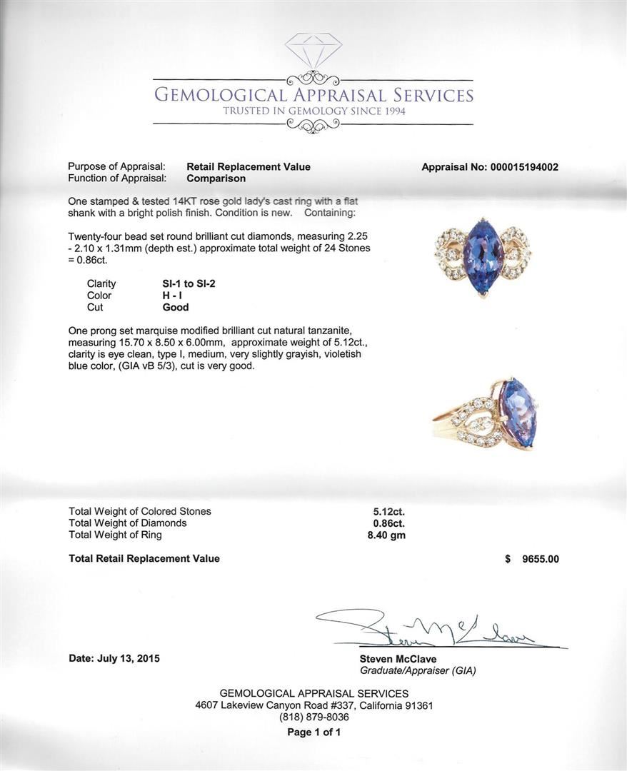 One stamped & tested 14KT rose gold lady's cast ring with a flat shank with a bright polish finish. Condition is new. Containing: Twenty-four bead set round brilliant cut diamonds, measuring 2.25 - 2.10 x 1.31mm (depth est.) approximate total weight of 24 Stones = 0.86ct. Clarity: SI-1 to SI-2. Color: H - I. Cut: Good. One prong set marquise modified brilliant cut natural tanzanite, measuring 15.70 x 8.50 x 6.00mm, approximate weight of 5.12ct., clarity is eye clean, type I, medium, very slightly grayish, violetish blue color, (GIA vB 5/3), cut is very good. Total Weight of Colored Stones: 5.12ct. Total Weight of Diamonds: 0.86ct. Total Weight of Ring: 8.40 gm. GAS Appraised at $9,655.00.