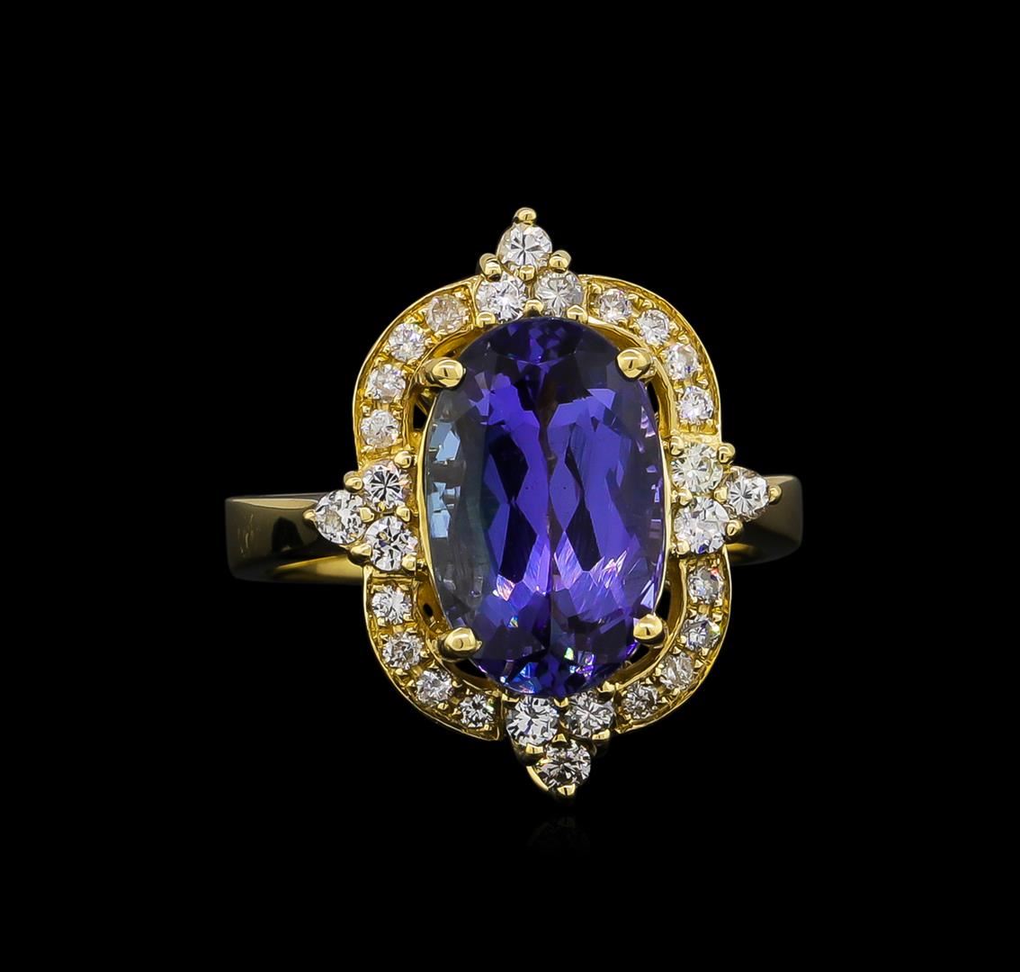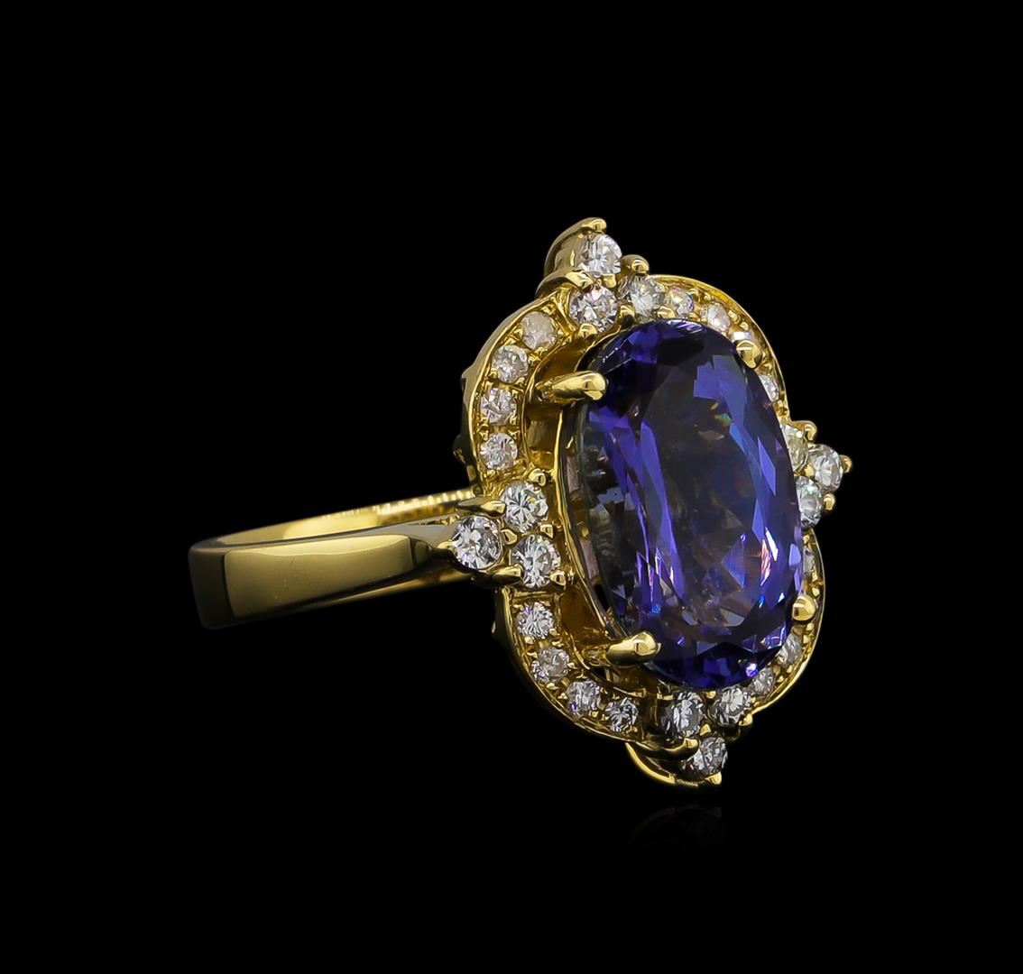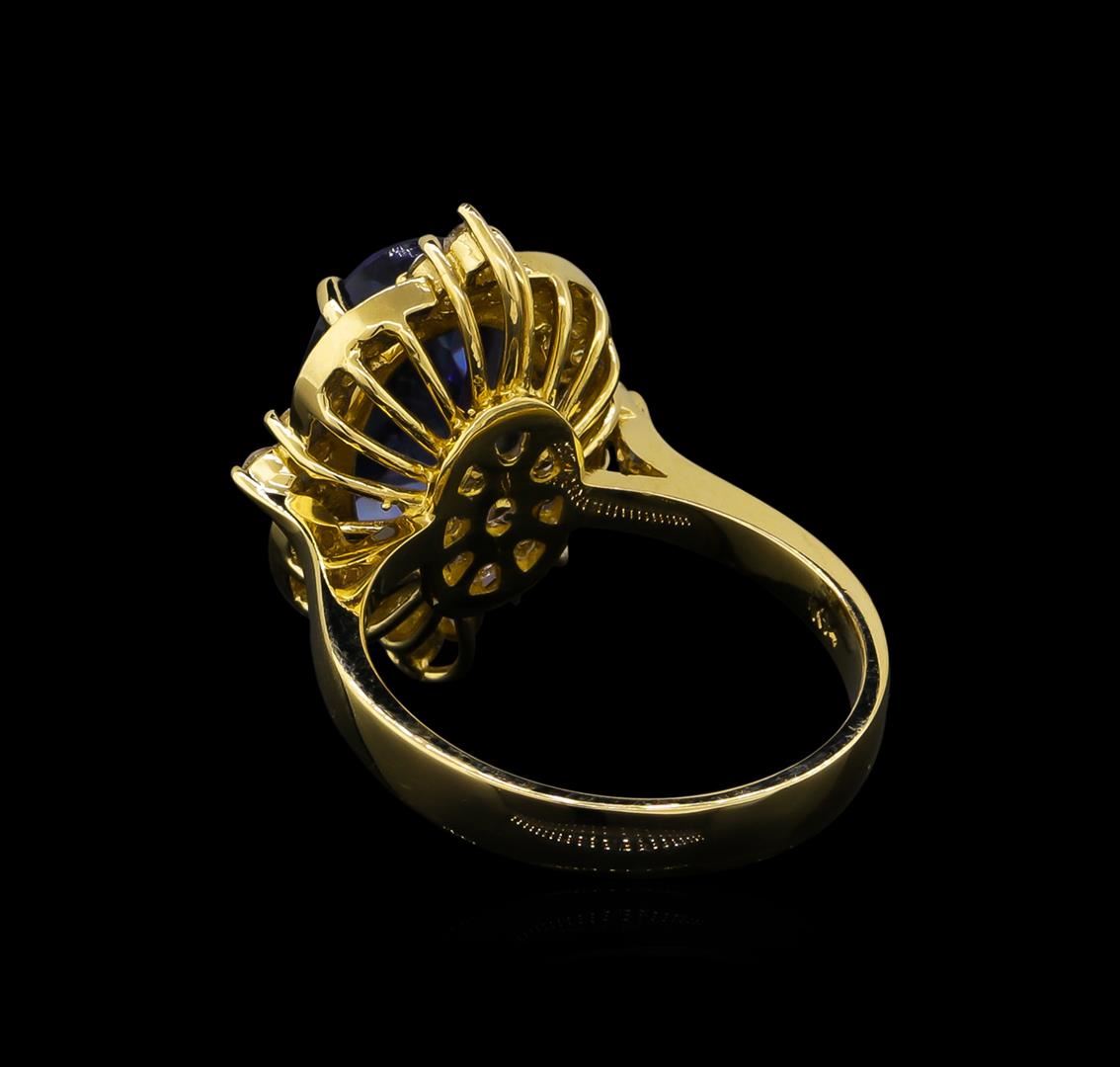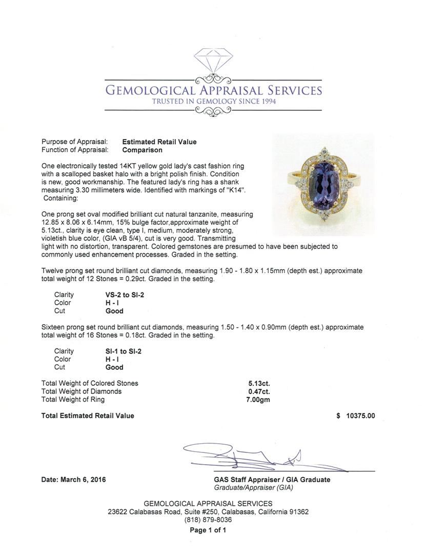 One electronically tested 14KT yellow gold lady's cast fashion ring with a scalloped basket halo with a bright polish finish. The featured lady's ring has a shank measuring 3.30 millimeters wide. Identified with markings of "K14". Condition is new, good workmanship. Containing: One prong set oval modified brilliant cut natural tanzanite, measuring 12.85 x 8.06 x 6.14mm, 15%. bulge factor, approximate weight of 5.13ct., clarity is eye clean, type I, medium, moderately strong, violetish blue color, (GIA vB 5/4), cut is very good. Transmitting light with no distortion, transparent. Colored gemstones are presumed to have been subjected to commonly used enhancement processes. Graded in the setting. Twelve prong set round brilliant cut diamonds, measuring 1.90 - 1.80 x 1.15mm (depth est.) approximate. Total Weight of 12 Stones = 0.29ct. Graded in the setting. Clarity: VS-2 to SI-2. Color: H - I. Cut Good Sixteen prong set round brilliant cut diamonds, measuring 1.50 - 1.40 x 0.90mm (depth est.) approximate. Total Weight of 16 Stones = 0.18ct. Graded in the setting. Clarity: SI-1 to SI-2. Color: H - I. Cut Good. Total Weight of Colored Stones 5.13ct. Total Weight of Diamonds 0.47ct. Total Weight of Ring 7.00gm. GAS Appraised at $10,375.00.