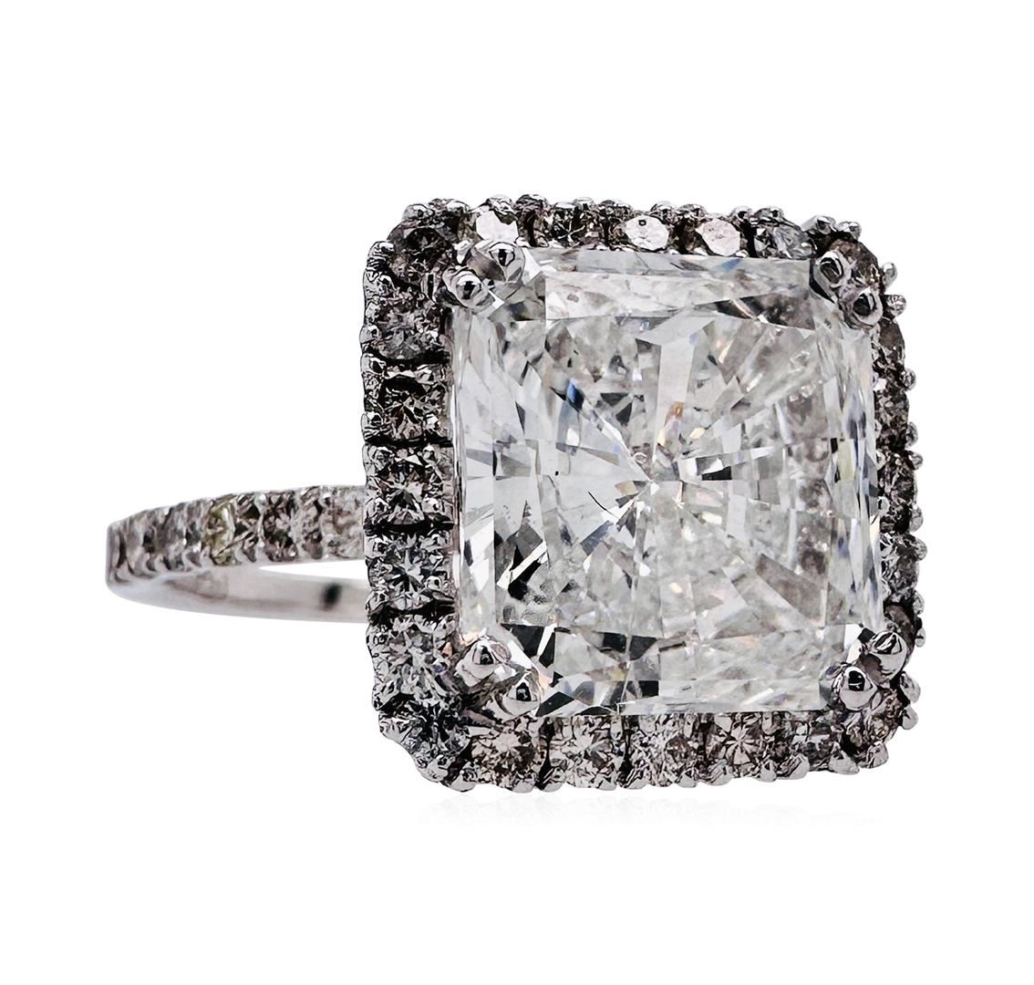 One electronically tested 14KT white gold lady's custom wax & cast basket halo wedding ring with a straight line shank with a bright polish finish. Condition is new, good workmanship. The featured lady's ring has a shank measuring 1.70 millimeters in width. Identified with markings of "14K". Containing: One prong set radiant shaped cut diamond, measuring 10.10x9.66 x 5.47mm (depth est.) approximate weight of 4.38ct. EGL USA Laboratory Report # US 924404701D. SI-1, Good. Thirty-eight prong set round brilliant cut diamonds, measuring 1.80-1.75 x 1.10mm (depth est.) approximate total weight of 38 Stones = 0.76ct. Graded in the setting. G-H VS-2 to I-1. Very Good. Total Weight of Diamonds: 5.14ct. Total Weight of Wedding Ring: 3.90gm. Total Estimated Retail Value: $ 131550.00