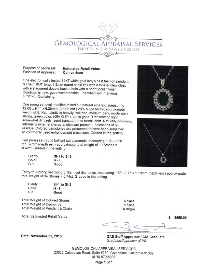One electronically tested 14KT white gold lady's cast fashion pendant & chain 18.0' long, 1.2mm round cable link with a lobster claw clasp with a staggered double basket halo with a bright polish finish. Identified with markings of 'K14'. Condition is new, good workmanship. Containing: One prong set oval modified mixed cut natural emerald, measuring 12.68 x 9.44 x 6.20mm, (depth est.) 20%. bulge factor, approximate weight of 5.14ct., clarity is heavily included, medium dark, moderately strong, green color, (GIA G 6/4), cut is good. Transmitting light somewhat diffusely, semi-transparent to translucent. Naturally occurring internal & external characteristics are present. Indications of oil residue. Colored gemstones are presumed to have been subjected to commonly used enhancement processes. Graded in the setting. Ten prong set round brilliant cut diamonds, measuring 2.30 - 2.20 x 1.37mm (depth est.) approximate total weight of 10 Stones = 0.42ct. Graded in the setting. Clarity SI-1 to SI-2. Color: H - I Cut Good Thirty-Four prong set round brilliant cut diamonds, measuring 1.80 - 1.75 x 1.10mm (depth est.) approximate total weight of 34 Stones = 0.74ct. Graded in the setting. Clarity SI-1 to SI-2. Color: H - I Cut Good. Total Weight of Colored Stones 5.14ct.. Total Weight of Diamonds 1.16ct.. Total Weight of Pendant & Chain 6.90gm. GAS Appraised at $8,555.00.
