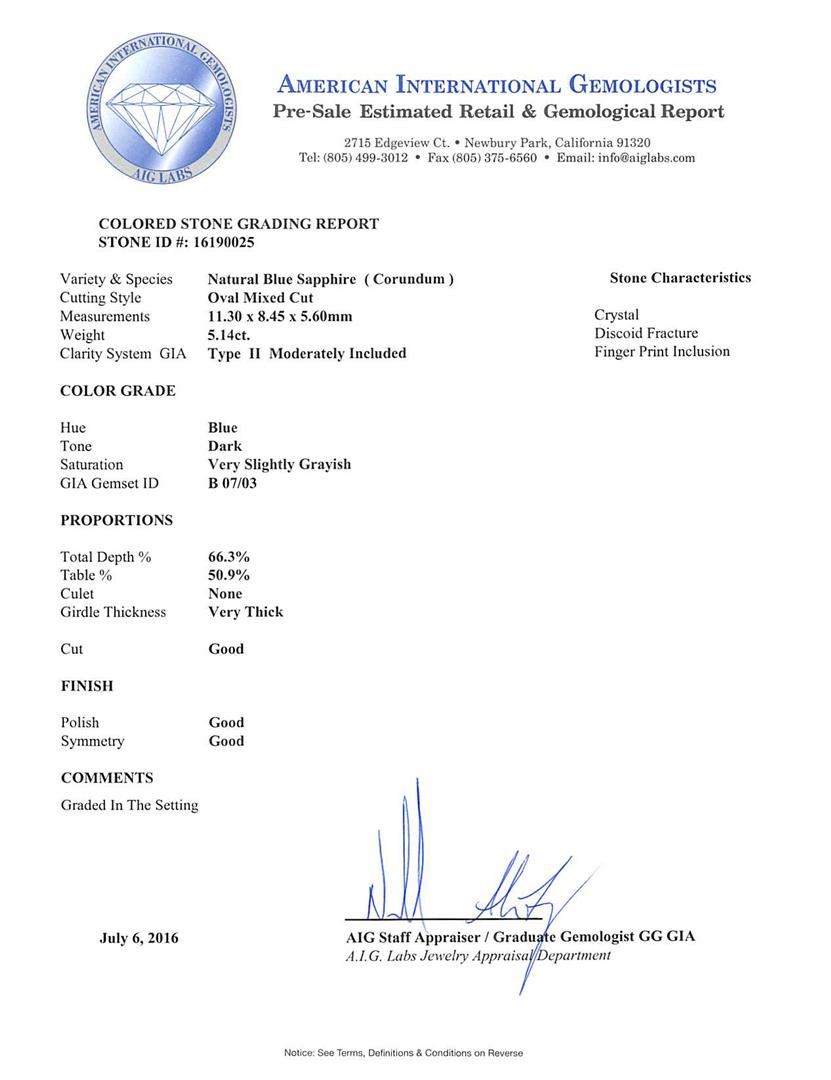One electronically tested 14KT white gold ladies cast sapphire and diamond ring with a bright polish finish. The featured sapphire is set between mirroring baguette cut diamonds, completed by a two millimeter wide band. Identified with markings of "14K". Condition is good. Containing: One prong set oval mixed cut natural blue sapphire, measuring 11.30 x 8.45 x 5.60mm, 15%. bulge factor, approximate weight of 5.14ct., clarity is moderately included, type II, dark, very slightly grayish, blue color, (GIA B 7/3), cut is good. Transmitting light with a minimum of distortion, transparent. Naturally occurring internal & external characteristics are present. Colored Stone Grading Report attached. Graded in the setting. Two prong set baguette cut (tapered) diamonds, measuring from 6.60 x 2.50 x 1.75mm (depth est.) to 6.80 x 2.50 x 1.75mm (depth est.) approximate total weight of 2 Stones = 0.58ct. Graded in the setting. Clarity: VVS-2 to VS-1. Color: I - J. Total Weight of Colored Stones 5.14ct. Total Weight of Diamonds 0.58ct. Total Weight of Ring 3.60gm. AIG Appraised at $11,670.00.