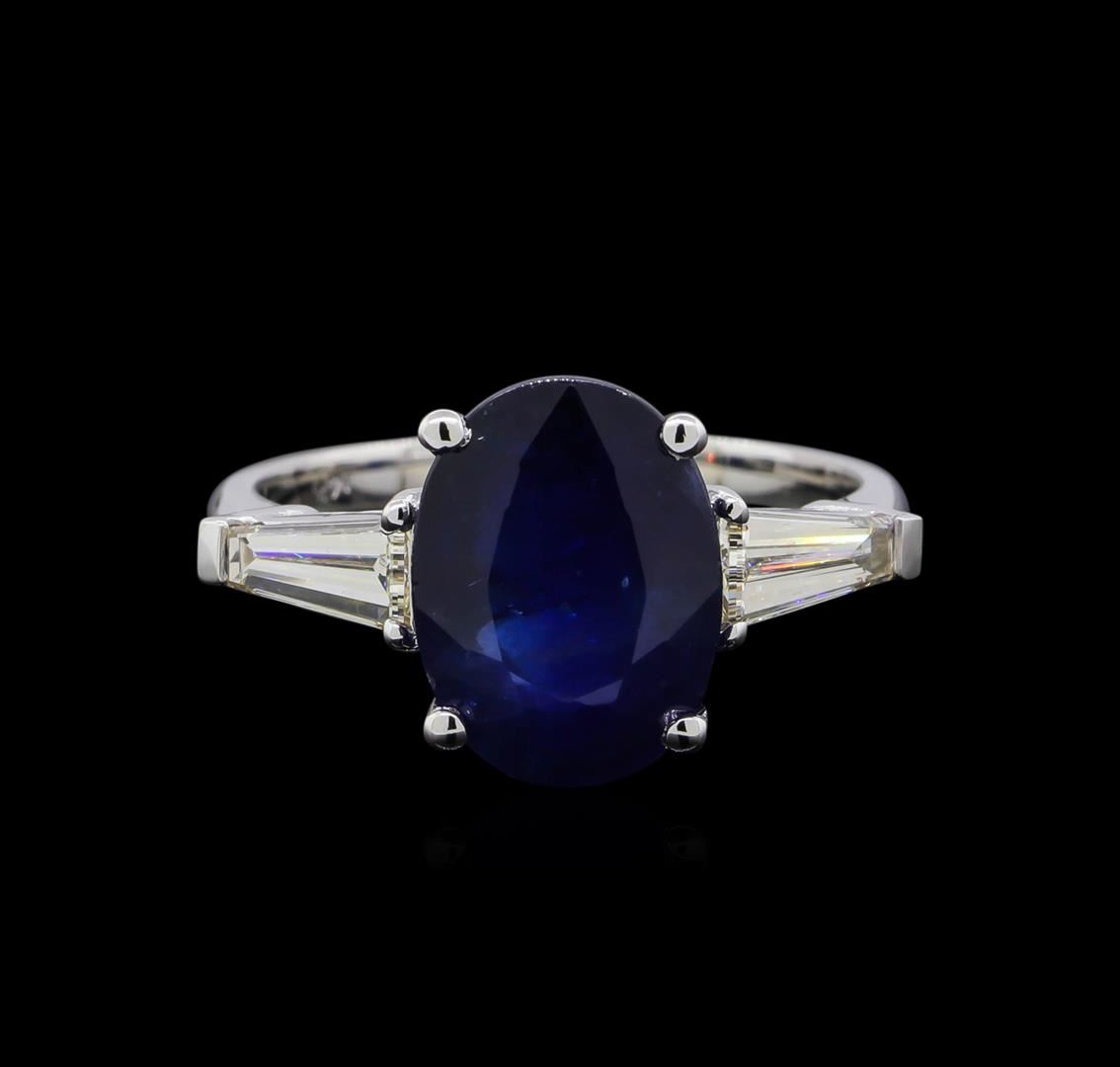 One electronically tested 14KT white gold ladies cast sapphire and diamond ring with a bright polish finish. The featured sapphire is set between mirroring baguette cut diamonds, completed by a two millimeter wide band. Identified with markings of "14K". Condition is good. Containing: One prong set oval mixed cut natural blue sapphire, measuring 11.30 x 8.45 x 5.60mm, 15%. bulge factor, approximate weight of 5.14ct., clarity is moderately included, type II, dark, very slightly grayish, blue color, (GIA B 7/3), cut is good. Transmitting light with a minimum of distortion, transparent. Naturally occurring internal & external characteristics are present. Colored Stone Grading Report attached. Graded in the setting. Two prong set baguette cut (tapered) diamonds, measuring from 6.60 x 2.50 x 1.75mm (depth est.) to 6.80 x 2.50 x 1.75mm (depth est.) approximate total weight of 2 Stones = 0.58ct. Graded in the setting. Clarity: VVS-2 to VS-1. Color: I - J. Total Weight of Colored Stones 5.14ct. Total Weight of Diamonds 0.58ct. Total Weight of Ring 3.60gm. AIG Appraised at $11,670.00.