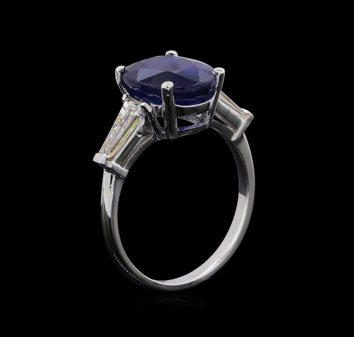 One electronically tested 14KT white gold ladies cast sapphire and diamond ring with a bright polish finish. The featured sapphire is set between mirroring baguette cut diamonds, completed by a two millimeter wide band. Identified with markings of "14K". Condition is good. Containing: One prong set oval mixed cut natural blue sapphire, measuring 11.30 x 8.45 x 5.60mm, 15%. bulge factor, approximate weight of 5.14ct., clarity is moderately included, type II, dark, very slightly grayish, blue color, (GIA B 7/3), cut is good. Transmitting light with a minimum of distortion, transparent. Naturally occurring internal & external characteristics are present. Colored Stone Grading Report attached. Graded in the setting. Two prong set baguette cut (tapered) diamonds, measuring from 6.60 x 2.50 x 1.75mm (depth est.) to 6.80 x 2.50 x 1.75mm (depth est.) approximate total weight of 2 Stones = 0.58ct. Graded in the setting. Clarity: VVS-2 to VS-1. Color: I - J. Total Weight of Colored Stones 5.14ct. Total Weight of Diamonds 0.58ct. Total Weight of Ring 3.60gm. AIG Appraised at $11,670.00.