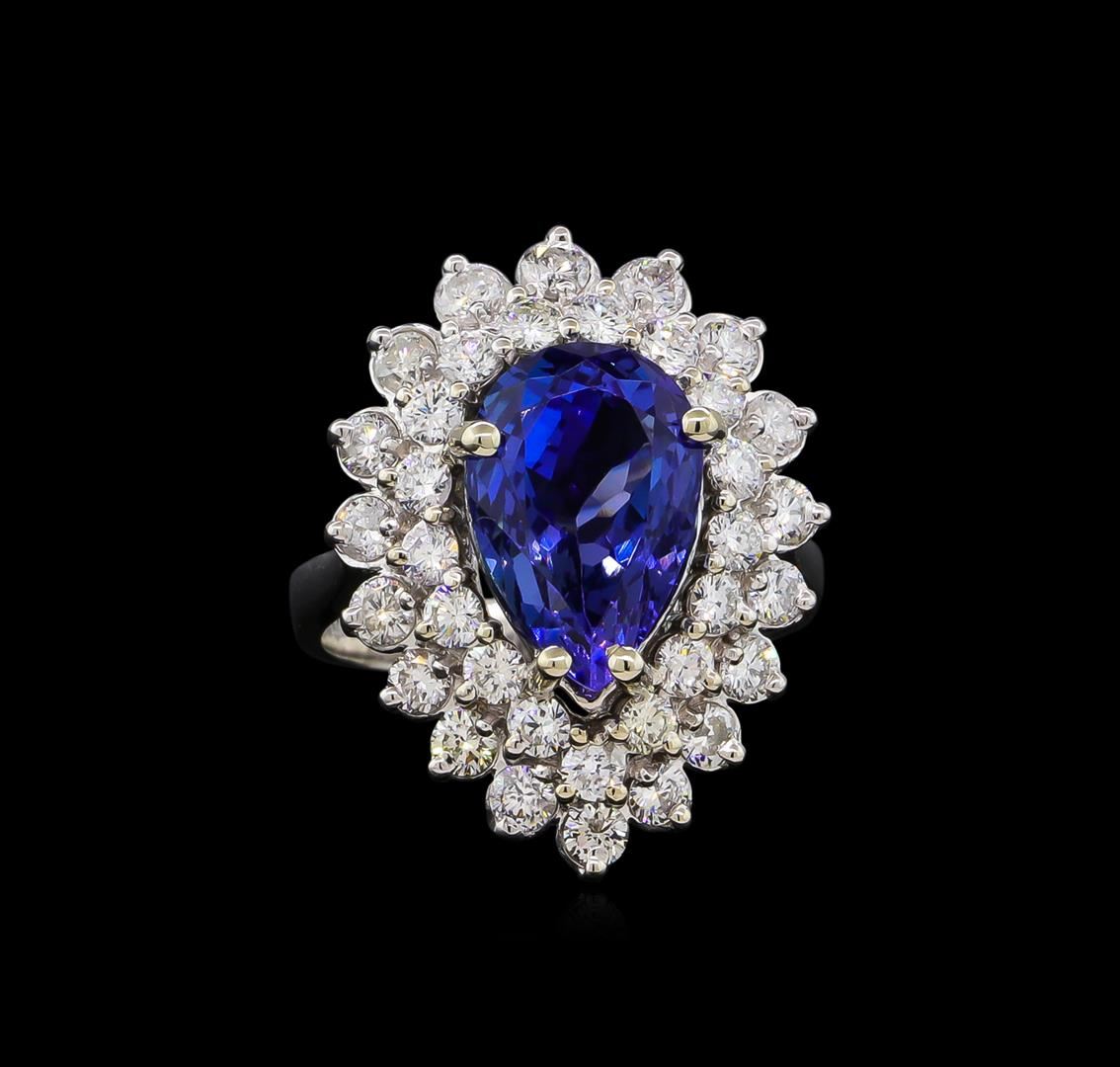 One electronically tested 14KT white gold lady's cast fashion ring with a double basket halo with a bright polish finish. The featured lady's ring has a shank measuring 2.90 millimeters wide. Identified with markings of "K14". Condition is new, good workmanship. Containing: One prong set pear modified brilliant cut natural tanzanite, measuring 12.68 x 8.43 x 6.98mm, 3%. bulge factor, approximate weight of 5.15ct., clarity is eye clean, type I, medium, moderately strong, violetish blue color, (GIA vB 5/4), cut is very good. Transmitting light with no distortion, transparent. Colored gemstones are presumed to have been subjected to commonly used enhancement processes. Graded in the setting. Eighteen prong set round brilliant cut diamonds, measuring 2.60 - 2.50 x 1.58mm (depth est.) approximate. Total Weight of 18 Stones = 1.12ct. Graded in the setting. Clarity: SI-1 to SI-2. Color: H - I. Cut Good Seventeen prong set round brilliant cut diamonds, measuring 2.30 - 2.25 x 1.41mm (depth est.) approximate. Total Weight of 17 Stones = 0.76ct. Graded in the setting. Clarity: VS-2 to SI-2. Color: H - I. Cut Good. Total Weight of Colored Stones 5.15ct. Total Weight of Diamonds 1.88ct. Total Weight of Ring 9.00gm. GAS Appraised at $13,885.00.