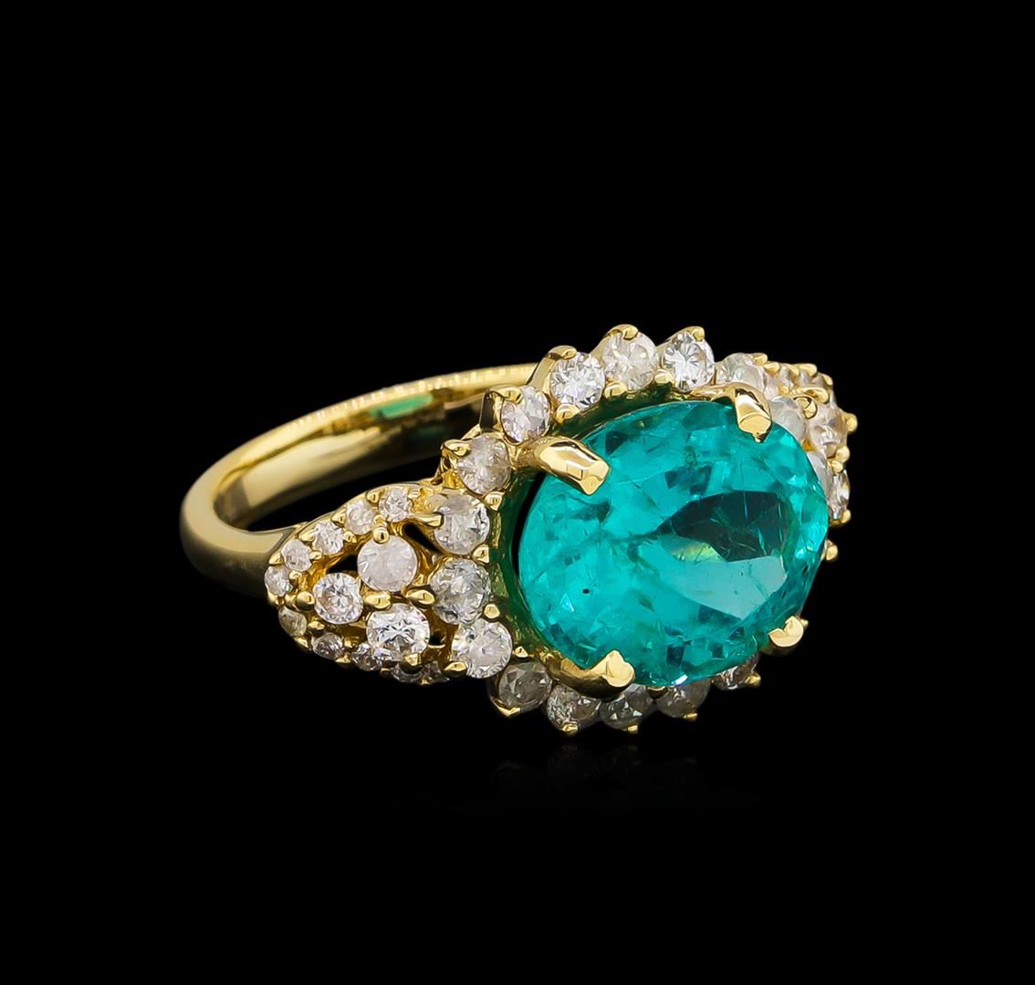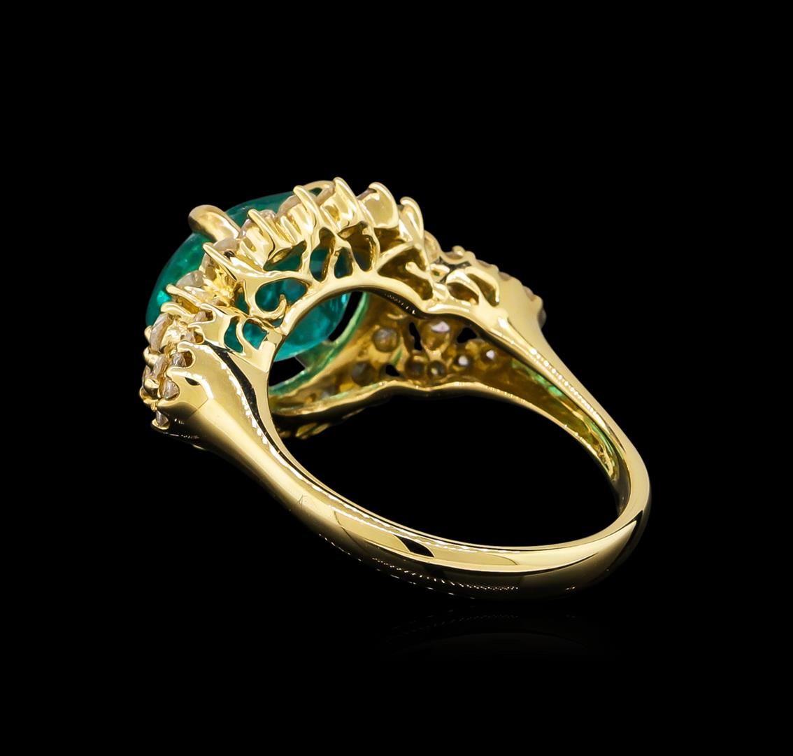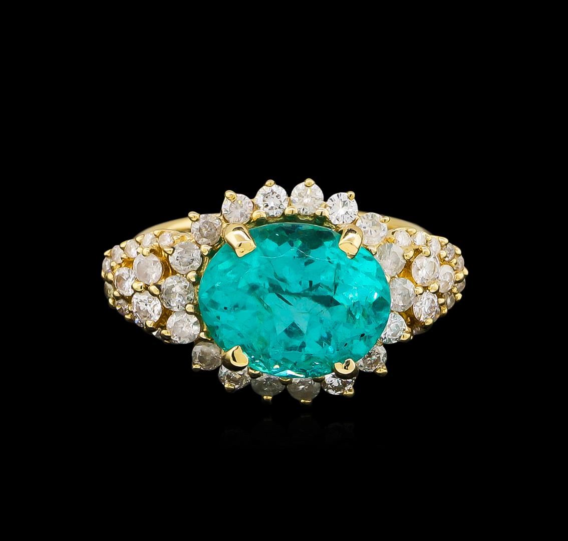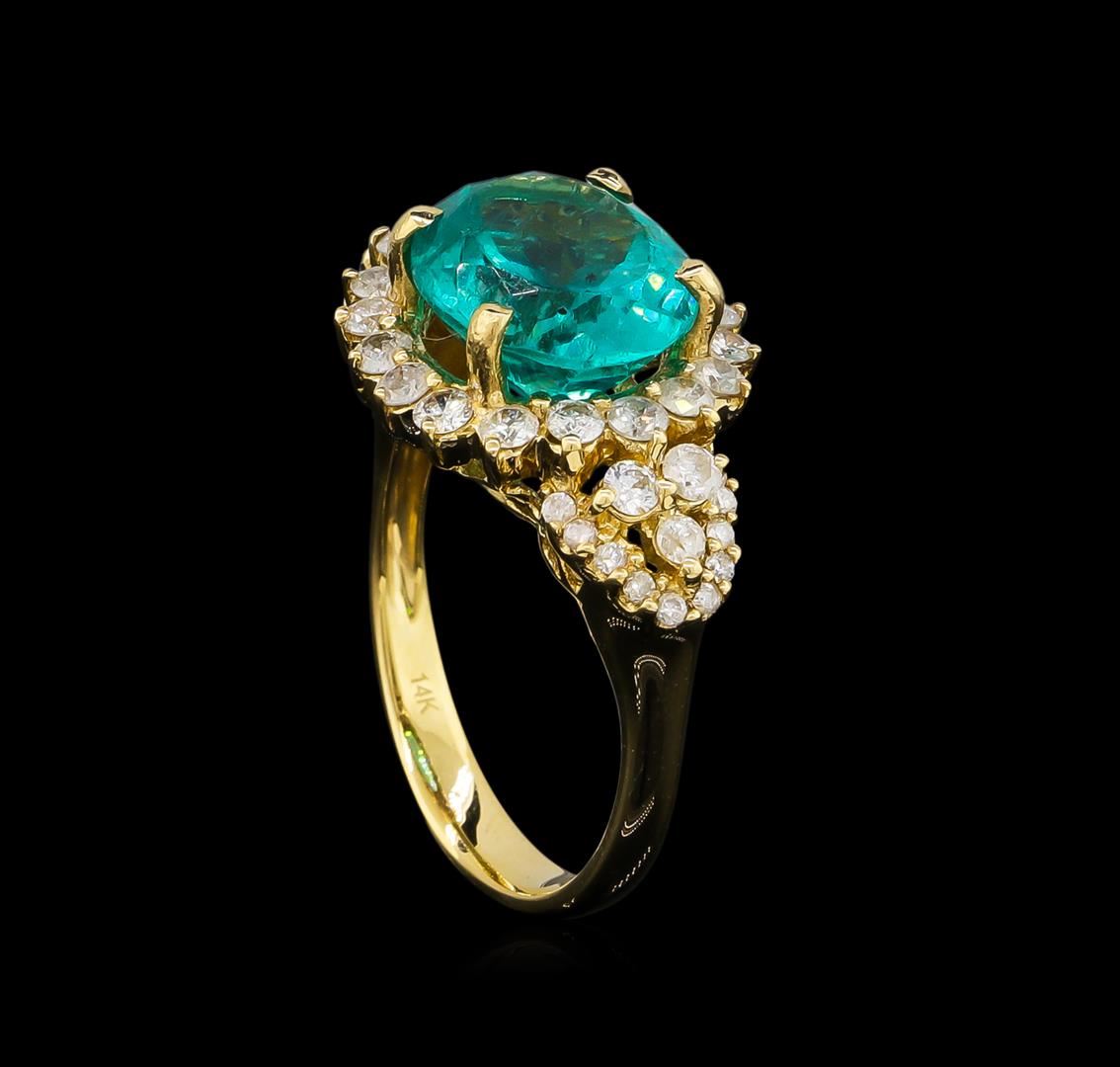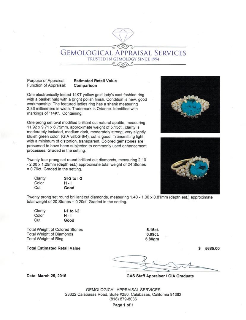 One electronically tested 14KT yellow gold lady's cast fashion ring with a basket halo with a bright polish finish. The featured ladies ring has a shank measuring 2.86 millimeters in width. Trademark is Orianne. Identified with markings of "14K". Condition is new, good workmanship. Containing: One prong set oval modified brilliant cut natural apatite, measuring 11.92 x 9.71 x 6.75mm, approximate weight of 5.15ct., clarity is moderately included, medium dark, moderately strong, very slightly bluish green color, (GIA vslbG 6/4), cut is good. Transmitting light with a minimum of distortion, transparent. Colored gemstones are presumed to have been subjected to commonly used enhancement processes. Graded in the setting. Twenty-Four prong set round brilliant cut diamonds, measuring 2.10 - 2.00 x 1.29mm (depth est.) approximate total weight of 24 Stones = 0.79ct. Graded in the setting. Clarity: SI-2 to I-2. Color: H - I. Cut Good Twenty prong set round brilliant cut diamonds, measuring 1.40 - 1.30 x 0.81mm (depth est.) approximate total weight of 20 Stones = 0.20ct. Graded in the setting. Clarity: I-1 to I-2. Color: H - I. Cut Good. Total Weight of Colored Stones 5.15ct. Total Weight of Diamonds 0.99ct. Total Weight of Ring 5.80gm. GAS Appraised at $5,685.00.