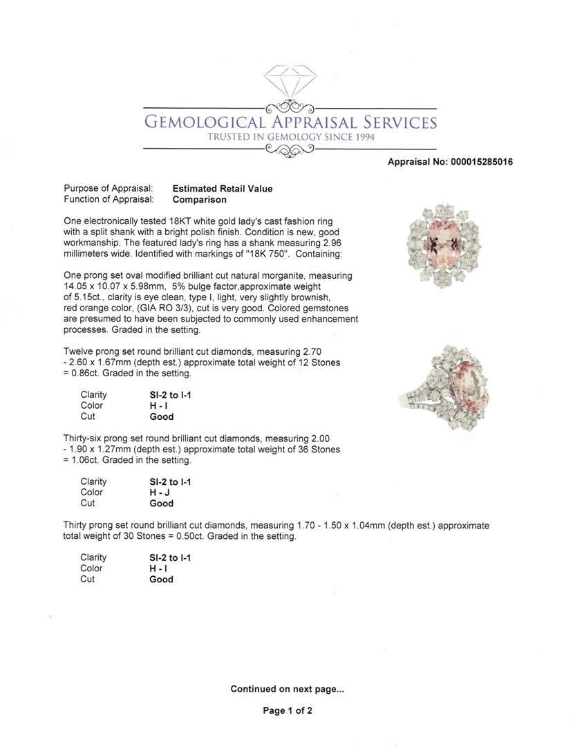 One electronically tested 18KT white gold lady's cast fashion ring with a split shank with a bright polish finish. The featured lady's ring has a shank measuring 2.96 millimeters wide. Identified with markings of "18K 750". Condition is new, good workmanship. Containing: One prong set oval modified brilliant cut natural morganite, measuring 14.05 x 10.07 x 5.98mm, 5% bulge factor, approximate weight of 5.15ct., clarity is eye clean, type I, light, very slightly brownish, red orange color, (GIA RO 3/3), cut is very good. Colored gemstones are presumed to have been subjected to commonly used enhancement processes. Graded in the setting. Twelve prong set round brilliant cut diamonds, measuring 2.70 - 2.60 x 1.67mm (depth est.) approximate total weight of 12 Stones = 0.86ct. Graded in the setting. Clarity: SI-2 to I-1. Color: H - I. Cut Good Thirty-Six prong set round brilliant cut diamonds, measuring 2.00 - 1.90 x 1.27mm (depth est.) approximate total weight of 36 Stones = 1.06ct. Graded in the setting. Clarity: SI-2 to I-1. Color: H - Good Thirty prong set round brilliant cut diamonds, measuring 1.70 - 1.50 x 1.04mm (depth est.) approximate total weight of 30 Stones = 0.50ct. Graded in the setting. Clarity: SI-2 to I-1. Color: H - I. Cut Good Twelve prong set baguette cut diamonds, measuring from 2.50 x 1.25 x 1.06mm (depth est.) to 2.60 x 1.35 x 1.15mm (depth est.) approximate total weight of 12 Stones = 0.40ct. Graded in the setting. Clarity: VS-2 to SI-1. Color: G - I. Cut Good. Total Weight of Colored Stones 5.15ct. Total Weight of Diamonds 2.82ct. Total Weight of Ring 8.10gm. GAS Appraised at $8,700.00.