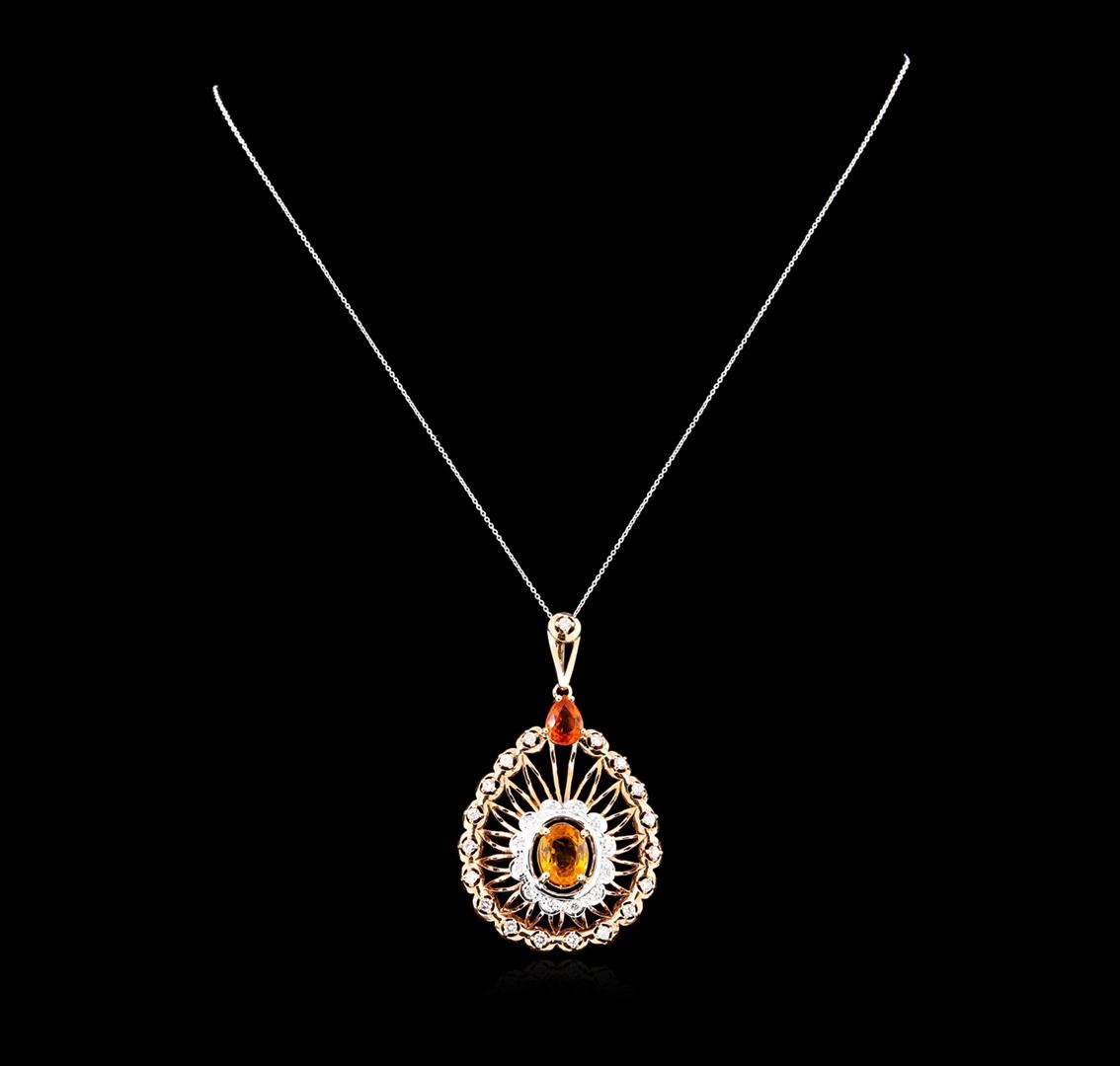 14K Rose Gold 5.15CT Sapphire 1.00CT Diamond Pendant. Description: Metal: 14k sold rose gold. Face Measurements: 32 x 54mm. Size: 16. Finish: Bright Polish. Total Item Weight: 12.5 grams. Markings: stamped 14k. Country Made: USA. Main Stone: sapphire. Quantity: 1. Shape: oval. Color: orange. Carat Total Weight: 3.15. Measurements: 8 x 10mm. Treatment: heating. Setting: prong. Hue: orangy brown. Saturation: moderately strong. Tone: dark. Clarity: type 2. Cut: very good. Secondary Stone: diamond. Quantity: 31. Shape: round. Color: white. Carat Total Weight: 1.00. Measurements: 2.2mm. Treatment: none. Setting: prong. Color Grade: G-H. Clarity: SI1-SI2. Cut: very good. Side Stone: sapphire. Quantity: 1. Shape: pear. Color: orange. Carat Total Weight: 2.00. Measurements: 6 x 8mm. Treatment: heating. Setting: prong. Hue: orangy brown. Saturation: moderately strong. Tone: dark. Clarity: type 2. Cut: very good. Excellent Workmanship. Gemstones graded in the mounting. BHGL Appraised at $11,650.00.