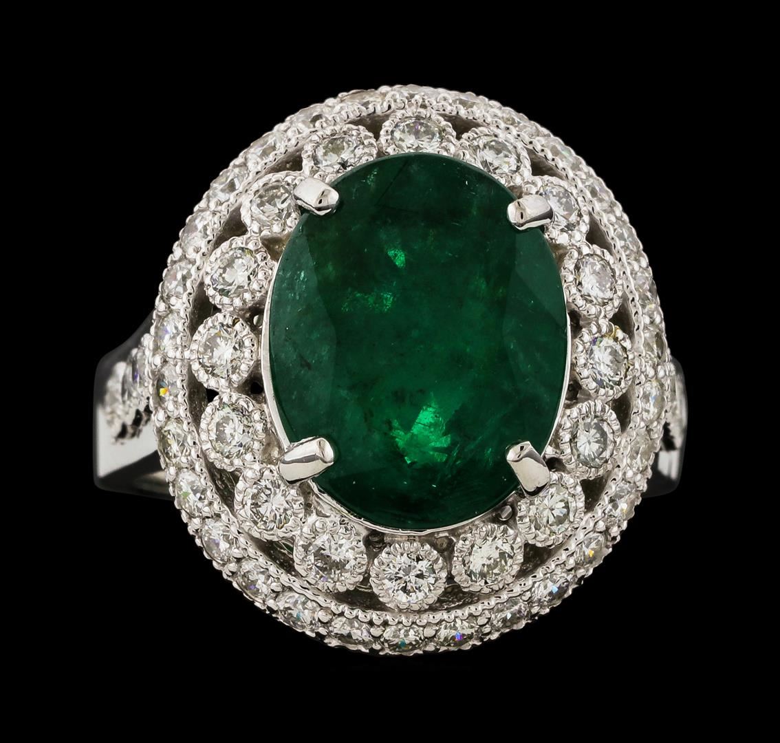 One electronically tested 14KT white gold lady's cast fashion ring with a cathedral double basket halo with a bright polish with milgrain detailing finish. The featured lady's ring has a shank measuring 3.07 millimeters wide. Identified with markings of 'K14'. Condition is new, good workmanship. Containing: One prong set oval modified mixed cut natural emerald, measuring 12.50 x 9.80 x 6.36mm, (depth est.) 15%. bulge factor, approximate weight of 5.16ct., clarity is heavily included, medium dark, moderately strong, green color, (GIA G 6/4), cut is good. Transmitting light somewhat diffusely, semi-transparent to translucent. Naturally occurring internal & external characteristics are present. Indications of oil residue. Colored gemstones are presumed to have been subjected to commonly used enhancement processes. Graded in the setting. Twenty-Two bezel set round brilliant cut diamonds, measuring 2.00 - 1.90 x 1.17mm (depth est.) approximate total weight of 22 Stones = 0.60ct. Graded in the setting. Clarity SI-1 to SI-2. Color: H - I Cut Good Thirty prong set round brilliant cut diamonds, measuring 1.80 - 1.70 x 1.09mm (depth est.) approximate total weight of 30 Stones = 0.62ct. Graded in the setting. Clarity SI-1 to SI-2. Color: H - I Cut Good. Total Weight of Colored Stones 5.16ct.. Total Weight of Diamonds 1.22ct.. Total Weight of Ring 8.00gm. GAS Appraised at $9,555.00.