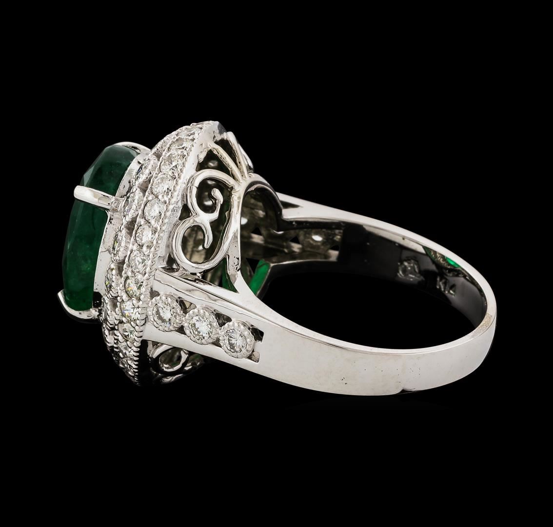 One electronically tested 14KT white gold lady's cast fashion ring with a cathedral double basket halo with a bright polish with milgrain detailing finish. The featured lady's ring has a shank measuring 3.07 millimeters wide. Identified with markings of 'K14'. Condition is new, good workmanship. Containing: One prong set oval modified mixed cut natural emerald, measuring 12.50 x 9.80 x 6.36mm, (depth est.) 15%. bulge factor, approximate weight of 5.16ct., clarity is heavily included, medium dark, moderately strong, green color, (GIA G 6/4), cut is good. Transmitting light somewhat diffusely, semi-transparent to translucent. Naturally occurring internal & external characteristics are present. Indications of oil residue. Colored gemstones are presumed to have been subjected to commonly used enhancement processes. Graded in the setting. Twenty-Two bezel set round brilliant cut diamonds, measuring 2.00 - 1.90 x 1.17mm (depth est.) approximate total weight of 22 Stones = 0.60ct. Graded in the setting. Clarity SI-1 to SI-2. Color: H - I Cut Good Thirty prong set round brilliant cut diamonds, measuring 1.80 - 1.70 x 1.09mm (depth est.) approximate total weight of 30 Stones = 0.62ct. Graded in the setting. Clarity SI-1 to SI-2. Color: H - I Cut Good. Total Weight of Colored Stones 5.16ct.. Total Weight of Diamonds 1.22ct.. Total Weight of Ring 8.00gm. GAS Appraised at $9,555.00.