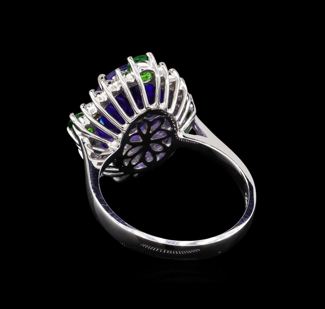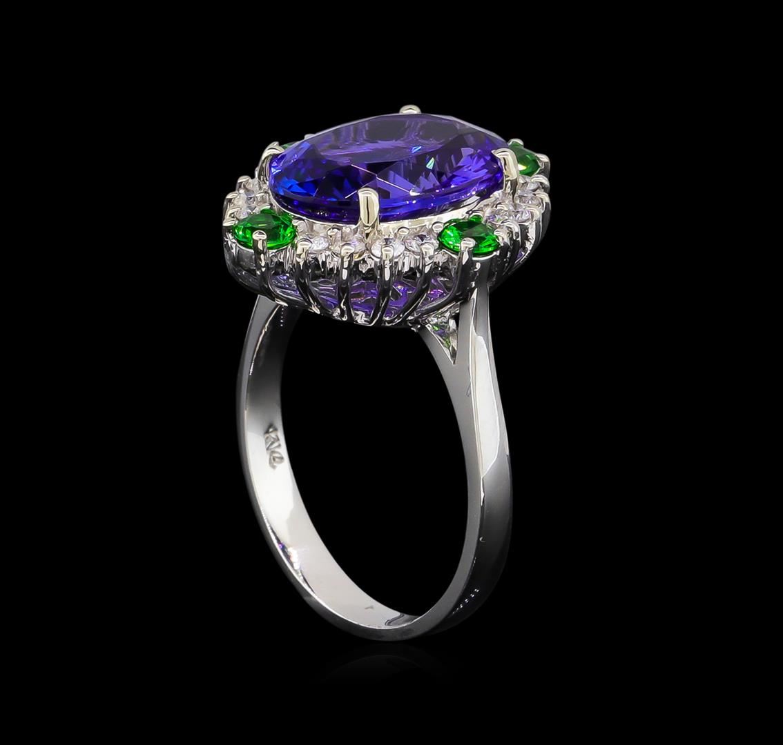 One electronically tested 14KT white gold lady's cast fashion ring with a basket halo with a bright polish finish. The featured lady's ring has a shank measuring 2.76 millimeters wide. Identified with markings of "K14". Condition is new, good workmanship. Containing: One prong set oval modified brilliant cut natural tanzanite, measuring 13.20 x 9.12 x 5.14mm, 5%. bulge factor, approximate weight of 4.60ct., clarity is eye clean, type I, medium dark, moderately strong, violetish blue color, (GIA vB 6/4), cut is very good. Transmitting light with no distortion, transparent. Colored gemstones are presumed to have been subjected to commonly used enhancement processes. Graded in the setting. Four prong set round modified brilliant cut natural tsavorite garnets, measuring 3.10 - 3.00 x 1.97 mm, approximate. Total Weight of 0.56ct., clarity is eye clean, type II, medium, strong, green color, (GIA G 5/5), cut is very good. Transmitting light with no distortion, transparent. Colored gemstones are presumed to have been subjected to commonly used enhancement processes. Graded in the setting. Sixteen prong set round brilliant cut diamonds, measuring 1.70 - 1.60 x 1.04mm (depth est.) approximate. Total Weight of 16 Stones = 0.28ct. Graded in the setting. Clarity: VS-2 to SI-2. Color: G - H. Cut Good. Total Weight of Colored Stones 5.16ct. Total Weight of Diamonds 0.28ct. Total Weight of Ring 6.00gm. GAS Appraised at $10,445.00.