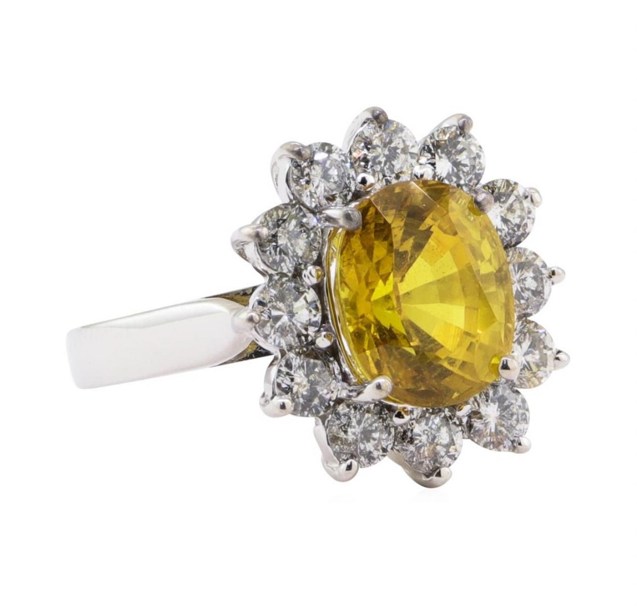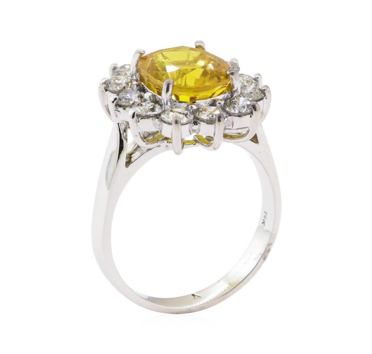 One electronically tested 14KT white gold ladies cast yellow sapphire & diamond ring. The featured yellow sapphire is set within a diamond bezel supported by an elaborate lattice under gallery, completed by a three millimeter wide band. Bright polish finish. Identified with markings of "14K". Condition is new, very good workmanship. Containing: One prong set oval cut natural yellow sapphire, measuring 10.00 x 8.30 x 6.95mm, 5% bulge factor, approximate weight of 5.16ct., clarity is eye clean, type II, medium, brownish, yellow color, (GIA Y 5/3), cut is good. Transmitting light with no distortion, transparent. Naturally occurring internal & external characteristics are present. Graded in the setting. Twelve prong set round brilliant cut diamonds, measuring 3.30 - 3.20 x 1.95mm (depth est.) exact total weight 12 Stones = 1.49ct. Graded in the setting. Clarity I-1 Color G - H Total Weight of Colored Stones 5.16 ct. Total Weight of Diamonds 1.49 ct. Total Weight of Ring 6.00 gm Estimated Retail Value $ 14,200.00 US