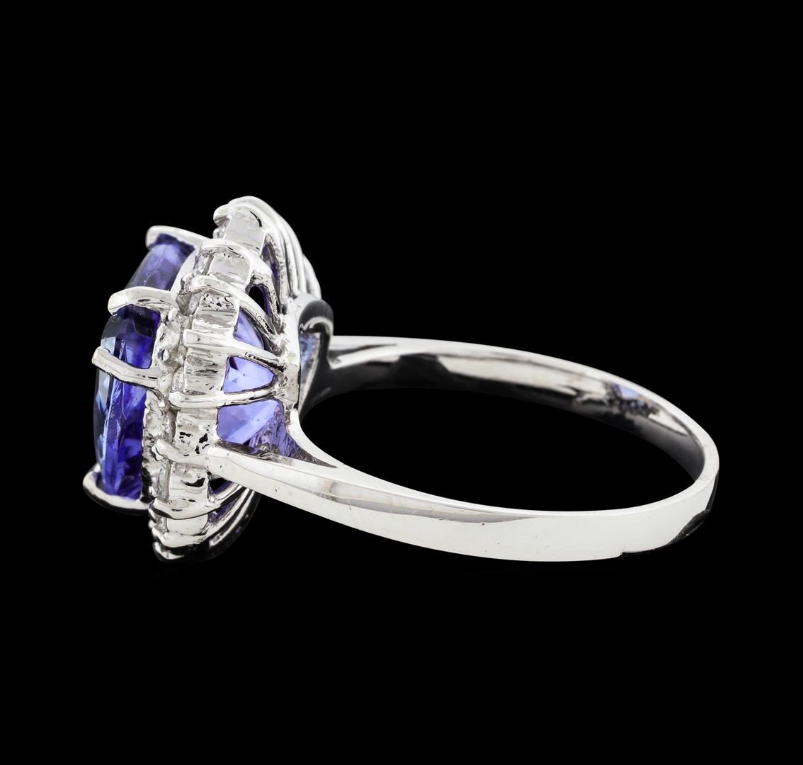 One electronically tested 14KT white gold lady's cast fashion ring with a cathedral shank with a basket halo with a bright polish finish. The featured lady's ring has a shank measuring 2.00 millimeters wide. Identified with markings of 'K14'. Condition is new, good workmanship. Containing: One prong set triangle modified brilliant cut natural tanzanite, measuring 11.22 x 11.02 x 7.77mm, (depth est.) approximate weight of 5.16ct., clarity is eye clean, medium, very slightly grayish, violetish blue color, (GIA vB 5/3), cut is very good. Transmitting light with no distortion, transparent. Colored gemstones are presumed to have been subjected to commonly used enhancement processes. Graded in the setting. Three prong set round brilliant cut diamonds, measuring 2.30 - 2.20 x 1.40mm (depth est.) approximate total weight of 3 Stones = 0.13ct. Graded in the setting. Clarity SI-1 to SI-2. Color: H - I Cut Good Twelve prong set round brilliant cut diamonds, measuring 2.00 - 1.85 x 1.20mm (depth est.) approximate total weight of 12 Stones = 0.33ct. Graded in the setting. Clarity SI-1 to SI-3. Color: H - I Cut Good Three prong set round brilliant cut diamonds, measuring 1.70 - 1.60 x 1.01mm (depth est.) approximate total weight of 3 Stones = 0.05ct. Graded in the setting. Clarity SI-1 to SI-3. Color: H - I Cut Good. Total Weight of Colored Stones 5.16ct.. Total Weight of Diamonds 0.51ct.. Total Weight of Ring 4.80gm. GAS Appraised at $9,530.00.