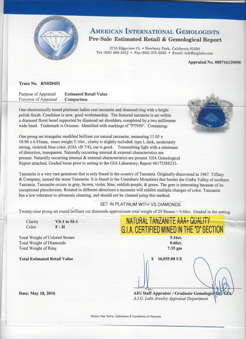 One 5.16ct Tanzanite and Diamond Ring - Platinum. AIG certified. See Appraisal for more details. AIG Appraised.