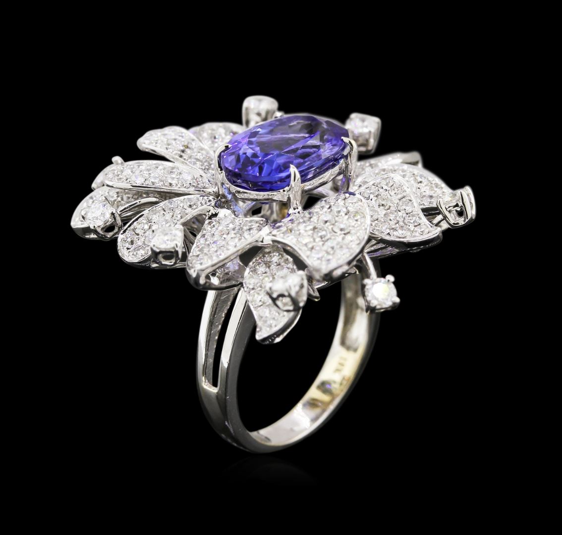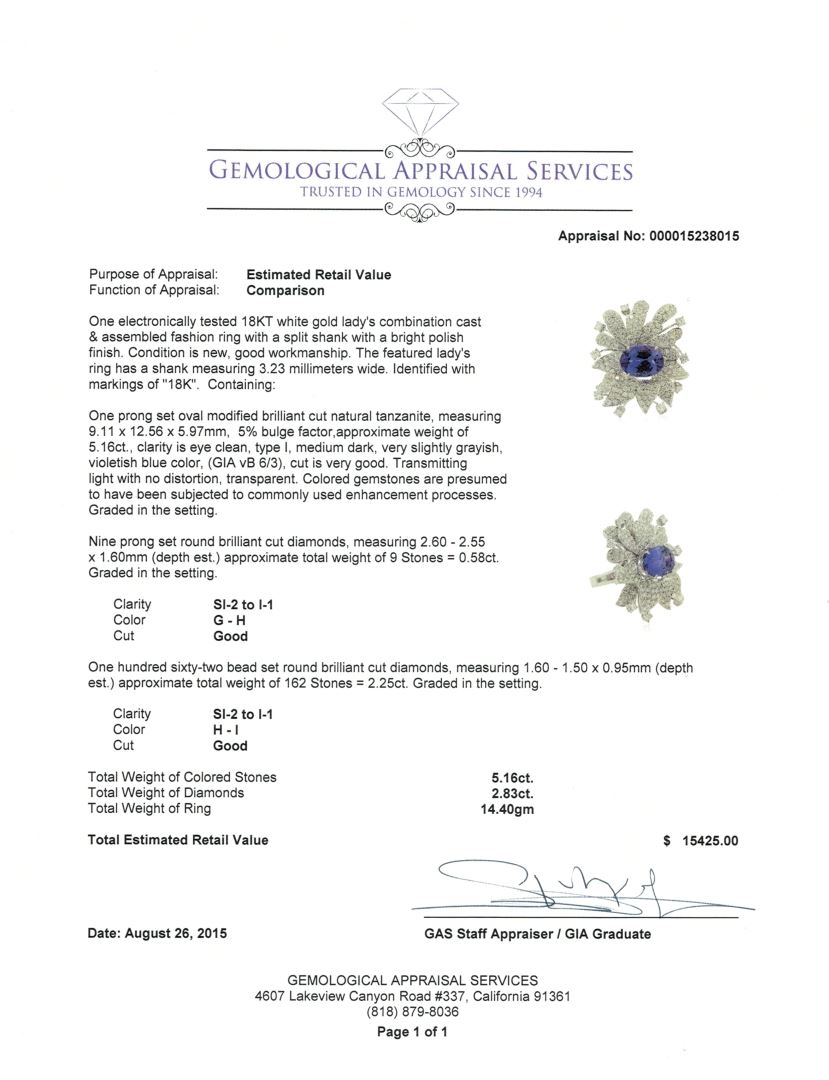 One electronically tested 18KT white gold lady's combination cast & assembled fashion ring with a split shank with a bright polish finish. The featured lady's ring has a shank measuring 3.23 millimeters wide. Identified with markings of "18K". Condition is new, good workmanship. Containing: One prong set oval modified brilliant cut natural tanzanite, measuring 9.11 x 12.56 x 5.97mm, 5% bulge factor, approximate weight of 5.16ct., clarity is eye clean, type I, medium dark, very slightly grayish, violetish blue color, (GIA vB 6/3), cut is very good. Transmitting light with no distortion, transparent. Colored gemstones are presumed to have been subjected to commonly used enhancement processes. Graded in the setting. Nine prong set round brilliant cut diamonds, measuring 2.60 - 2.55 x 1.60mm (depth est.) approximate total weight of 9 Stones = 0.58ct. Graded in the setting. Clarity: SI-2 to I-1. Color: G - Good One Hundred Sixty-Two bead set round brilliant cut diamonds, measuring 1.60 - 1.50 x 0.95mm (depth est.) approximate total weight of 162 Stones = 2.25ct. Graded in the setting. Clarity: SI-2 to I-1. Color: H - I. Cut Good. Total Weight of Colored Stones 5.16ct. Total Weight of Diamonds 2.83ct. Total Weight of Ring 14.40gm. GAS Appraised at $15,425.00.
