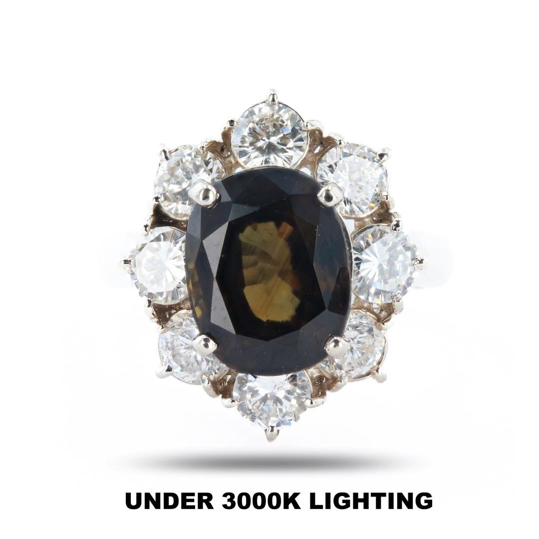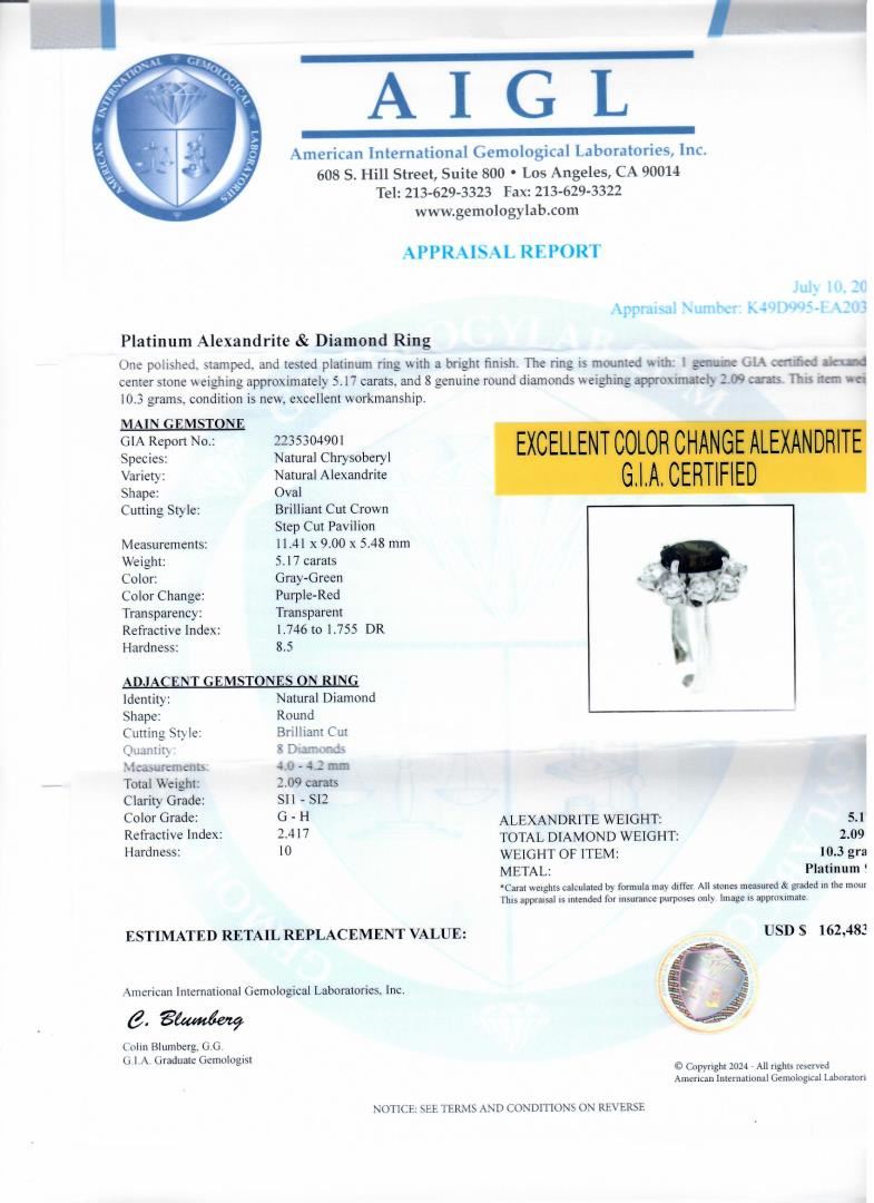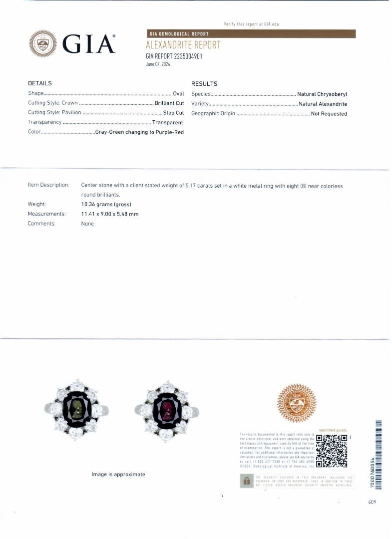 One polished, stamped, and tested platinum ring with a bright finish. The ring is mounted with: | genuine GIA certified alexandrite center stone weighing approximately 5.17 carats, and 8 genuine round diamonds weighing approximately 2.09 carats. This item weighs 10.3 grams, condition is new, excellent workmanship. #MAIN GEMSTONE# GIA Report No.: 2235304901 Species: Natural Chrysoberyl Variety: Natural Alexandrite Shape: Oval Cutting Style: Brilliant Cut Crown, Step Cut Pavilion Measurements: 11.41 x 9.00 x 5.48mm Weight: 5.17 carats Color: Gray-Green Color Change: Purple-Red Transparency: Transparent Refractive Index: 1.746 to 1.755 DR Hardness: 8.5 #ADJACENT GEMSTONES ON RING# Identity: Natural Diamond Shape: Round Cutting Style: Brilliant Cut Quantity: 8 Diamonds Measurements: 4.0 - 4.2mm Total Weight: 2.09 carats Clarity Grade: SI1-SI2 Color Grade: G-H Refractive Index: 2.417 Hardness: 10 ALEXANDRITE WEIGHT: 5.17 ct TOTAL DIAMOND WEIGHT: 2.09 cts WEIGHT OF ITEM: 10.3 grams METAL: Platinum Size: 6