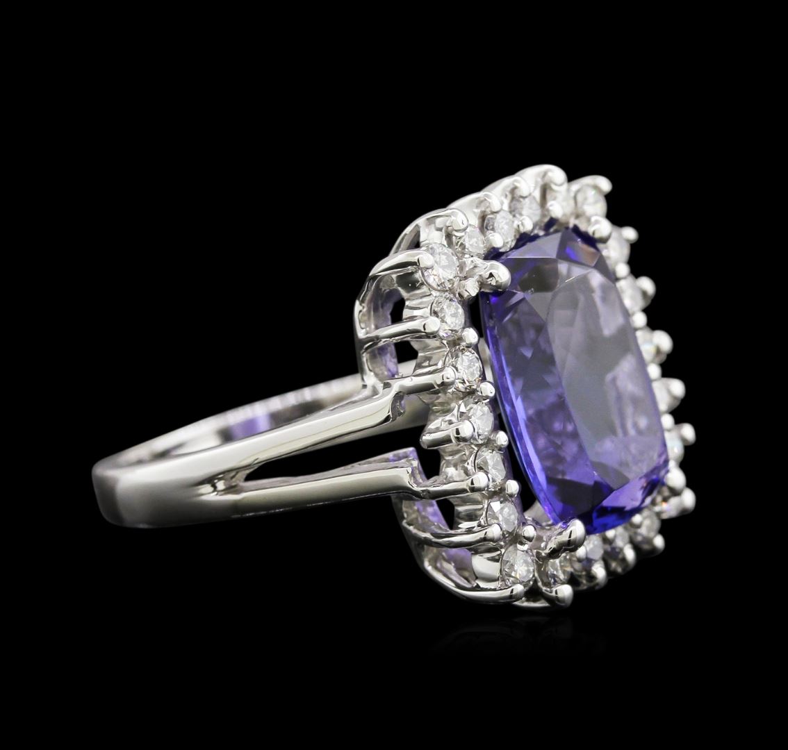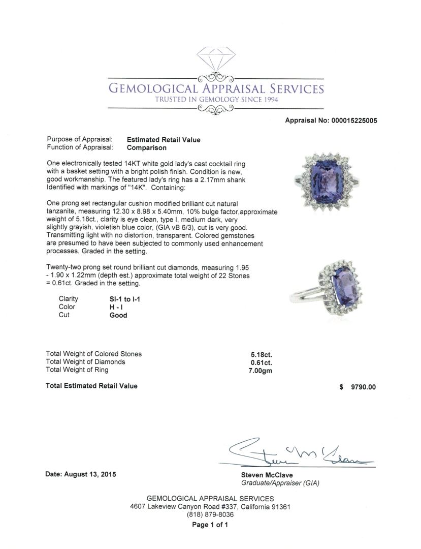 One electronically tested 14KT white gold lady's cast cocktail ring with a basket setting with a bright polish finish. The featured lady's ring has a 2.17mm shank Identified with markings of "14K". Condition is new, good workmanship. Containing: One prong set rectangular cushion modified brilliant cut natural tanzanite, measuring 12.30 x 8.98 x 5.40mm, 10% bulge factor, approximate weight of 5.18ct., clarity is eye clean, type I, medium dark, very slightly grayish, violetish blue color, (GIA vB 6/3), cut is very good. Transmitting light with no distortion, transparent. Colored gemstones are presumed to have been subjected to commonly used enhancement processes. Graded in the setting. Twenty-Two prong set round brilliant cut diamonds, measuring 1.95 - 1.90 x 1.22mm (depth est.) approximate total weight of 22 Stones = 0.61ct. Graded in the setting. Clarity: SI-1 to I-1. Color: H - I. Cut Good. Total Weight of Colored Stones 5.18ct. Total Weight of Diamonds 0.61ct. Total Weight of Ring 7.00gm. GAS Appraised at $9,790.00.