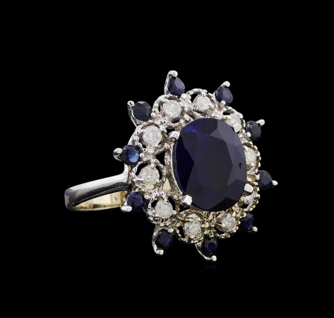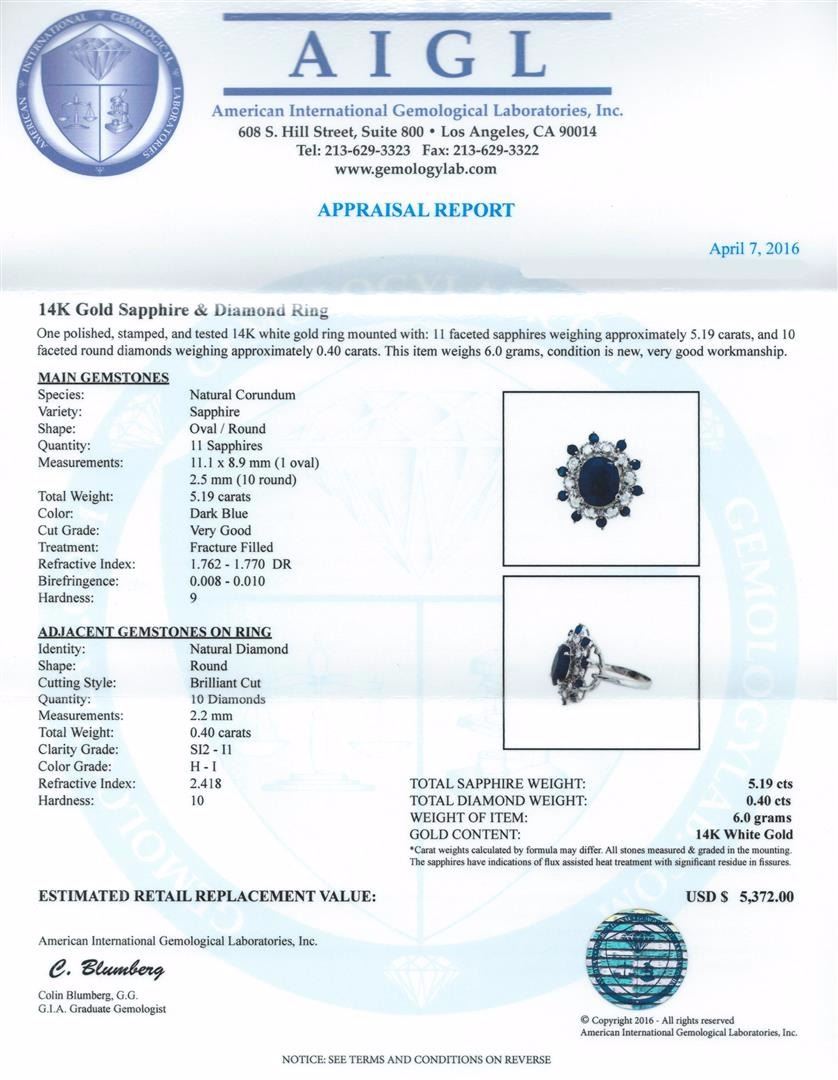 14K Gold Sapphire & Diamond Ring. One polished, stamped, and tested 14K white gold ring mounted with: 11 Faceted sapphires weighing approximately 5.19 carat, and 10 faceted round diamonds weighing approximately 0.40 carats. This item weighs 6.0 grams, condition is new, very good workmanship. Main Gemstones: Species: Natural Corundum. Variety: Sapphire. Shape: Oval/Round. Quantity: 11 Sapphires. Measurements: 11.1 x 8.9 mm ( 1 oval) 2.5 mm (10 round). Total weight: 5.19 carats. Color: Dark blue. Cut grade: Very good. Treatment: Fracture filled. Refractive index: 1.762-1.770 DR. Birefringence: 0.008-0.010. Hardness: 9. Adjacent gemstones on Ring. Identity: Natural Diamond. Shape: round. Cutting style: Brilliant cut. Quantity: 10 Diamonds. Measurements: 2.2 mm. total weight: 0.40 carats. Clarity Grade: SI2-I1. Color grade: H-I. Refractive index: 2.418. Hardness: 10. Gold Content: 14K White gold. AIGL Appraised at $5,372.00.