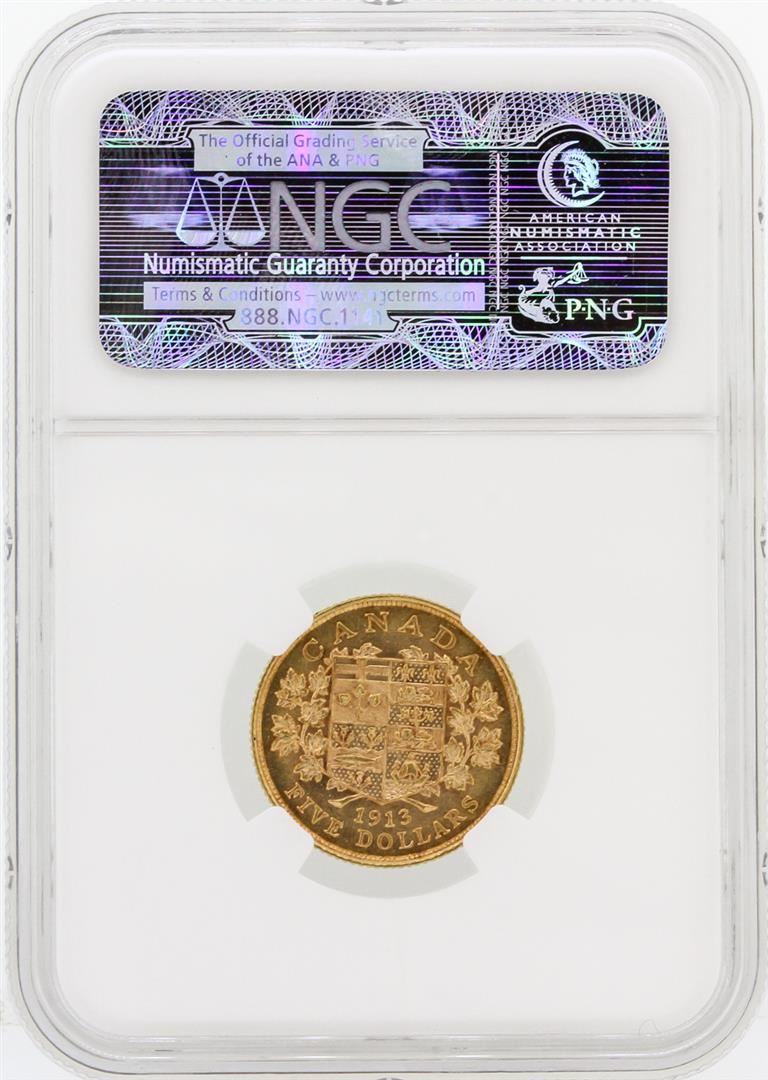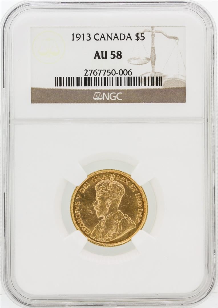 One $5 1913 NGC AU58 Canada Gold Coin. NGC Certified.