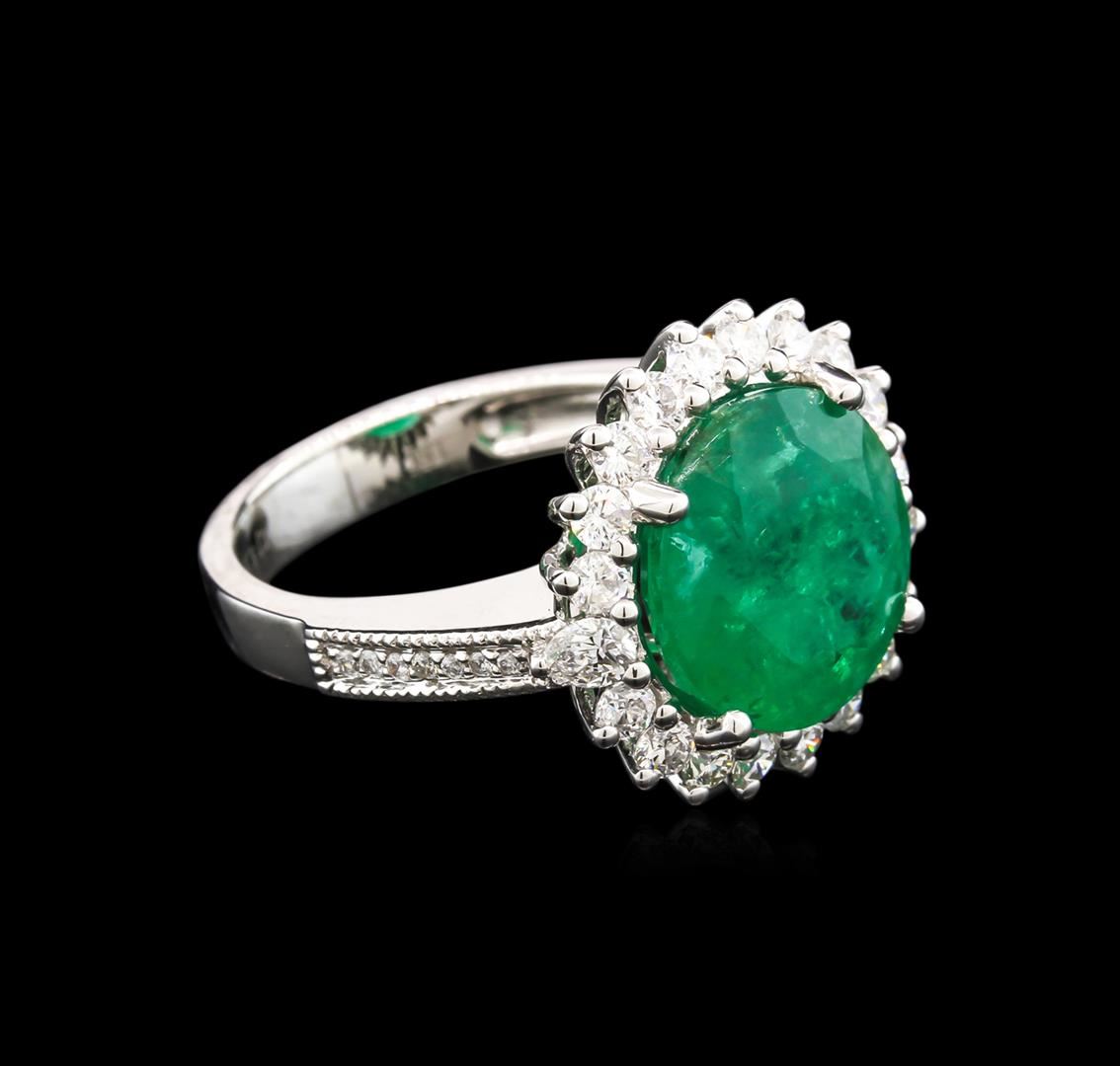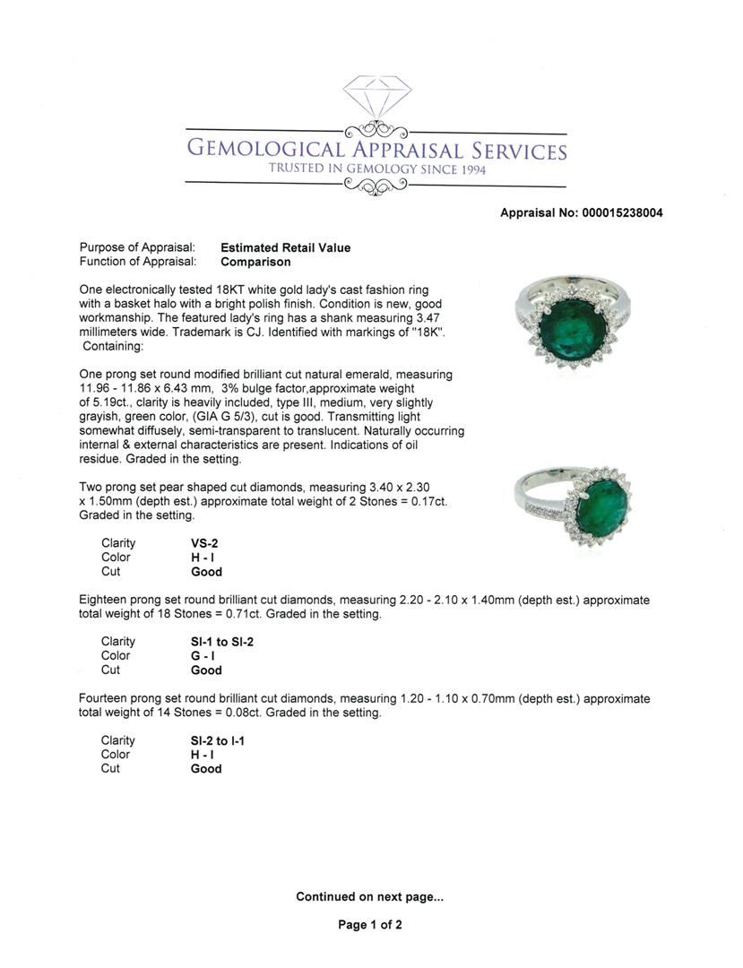 One electronically tested 18KT white gold lady's cast fashion ring with a basket halo with a bright polish finish. The featured lady's ring has a shank measuring 3.47 millimeters wide. Trademark is CJ. Identified with markings of "18K". Condition is new, good workmanship. Containing: One prong set round modified brilliant cut natural emerald, measuring 11.96 - 11.86 x 6.43 mm, 3% bulge factor, approximate weight of 5.19ct., clarity is heavily included, type III, medium, very slightly grayish, green color, (GIA G 5/3), cut is good. Transmitting light somewhat diffusely, semi-transparent to translucent. Naturally occurring internal & external characteristics are present. Indications of oil residue. Graded in the setting. Two prong set pear shaped cut diamonds, measuring 3.40 x 2.30 x 1.50mm (depth est.) approximate total weight of 2 Stones = 0.17ct. Graded in the setting. Clarity: VS-2. Color: H - I. Cut Good Eighteen prong set round brilliant cut diamonds, measuring 2.20 - 2.10 x 1.40mm (depth est.) approximate total weight of 18 Stones = 0.71ct. Graded in the setting. Clarity: SI-1 to SI-2. Color: G - I. Cut Good Fourteen prong set round brilliant cut diamonds, measuring 1.20 - 1.10 x 0.70mm (depth est.) approximate total weight of 14 Stones = 0.08ct. Graded in the setting. Clarity: SI-2 to I-1. Color: H - I. Cut Good. Total Weight of Colored Stones 5.19ct. Total Weight of Diamonds 0.96ct. Total Weight of Ring 7.10gm. GAS Appraised at $9,900.00.