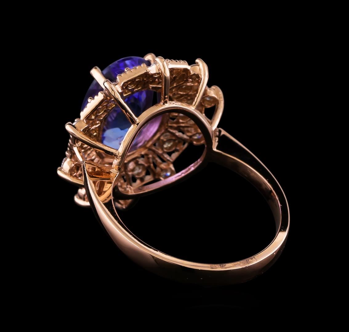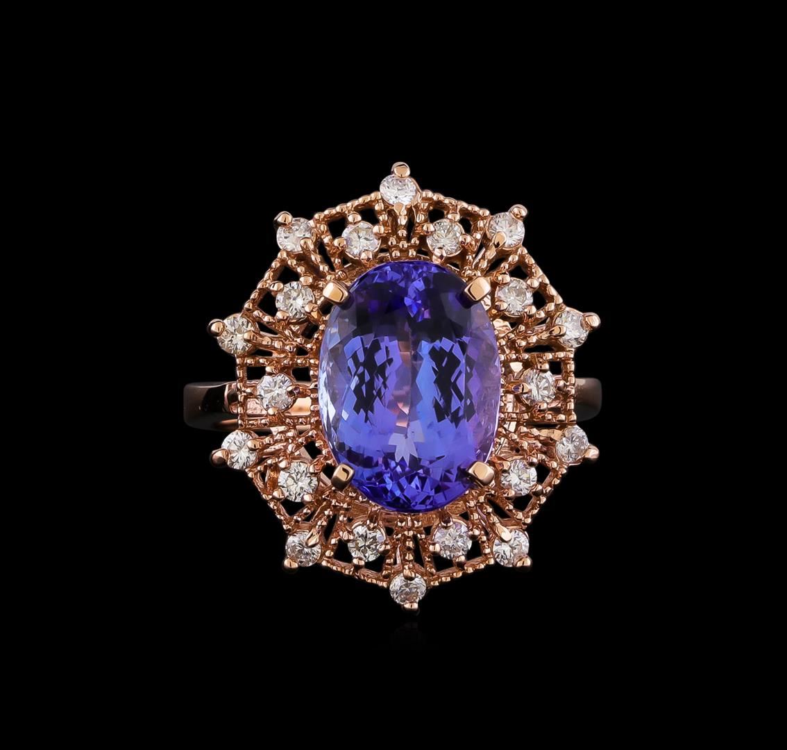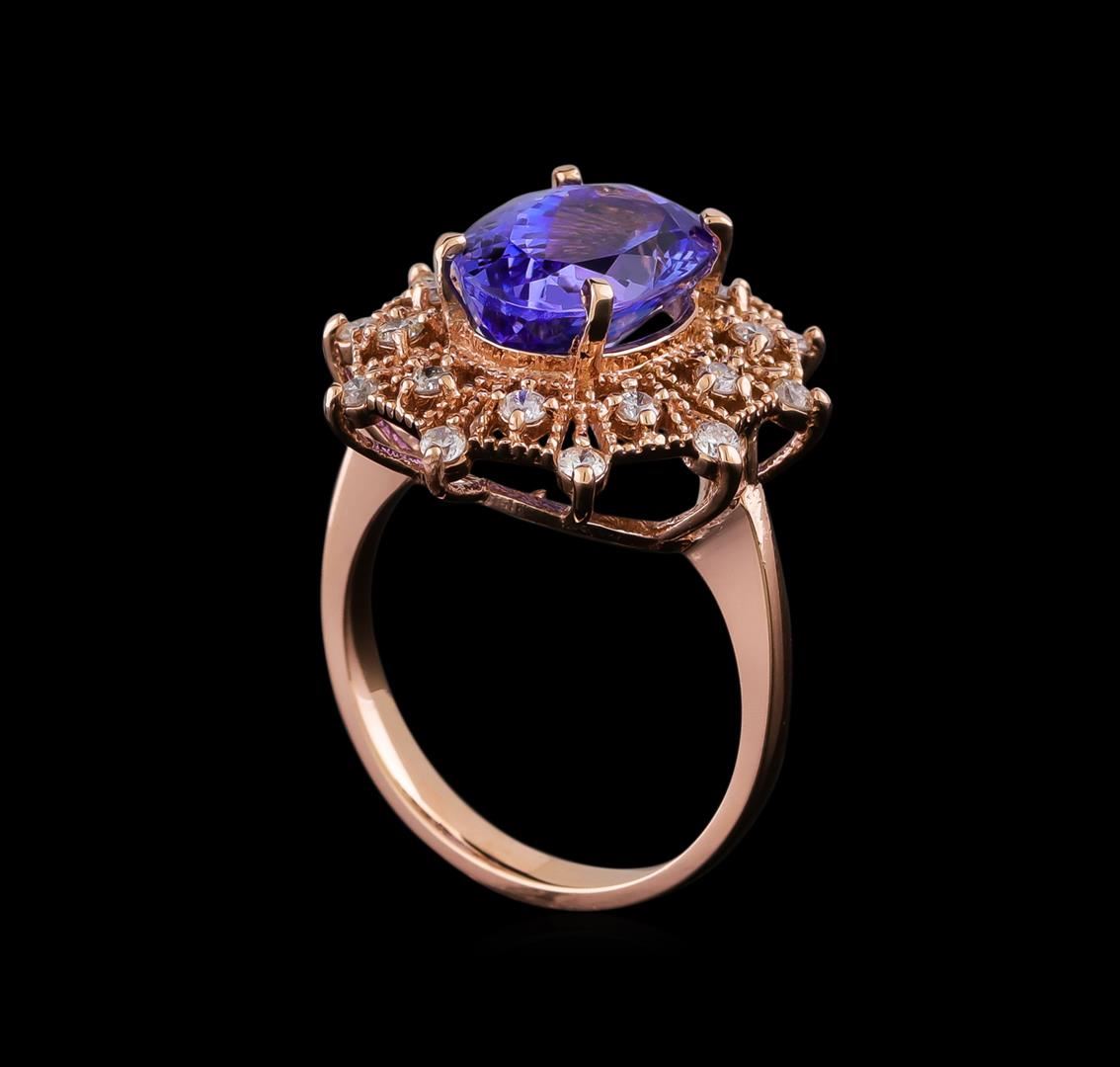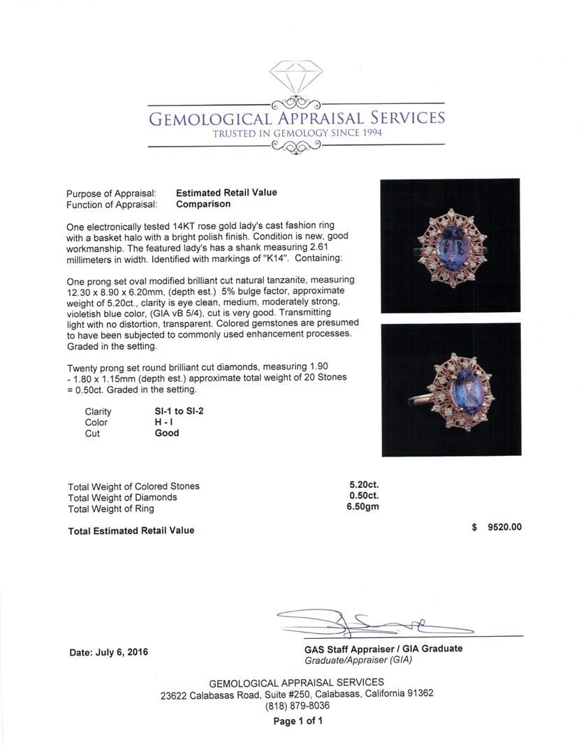 One electronically tested 14KT rose gold lady's cast fashion ring with a basket halo with a bright polish finish. The featured lady's has a shank measuring 2.61 millimeters in width. Identified with markings of "K14". Condition is new, good workmanship. Containing: One prong set oval modified brilliant cut natural tanzanite, measuring 12.30 x 8.90 x 6.20mm, (depth est.) 5%. bulge factor, approximate weight of 5.20ct., clarity is eye clean, medium, moderately strong, violetish blue color, (GIA vB 5/4), cut is very good. Transmitting light with no distortion, transparent. Colored gemstones are presumed to have been subjected to commonly used enhancement processes. Graded in the setting. Twenty prong set round brilliant cut diamonds, measuring 1.90 - 1.80 x 1.15mm (depth est.) approximate total weight of 20 Stones = 0.50ct. Graded in the setting. Clarity: SI-1 to SI-2. Color: H - I. Cut Good. Total Weight of Colored Stones 5.20ct. Total Weight of Diamonds 0.50ct. Total Weight of Ring 6.50gm. GAS Appraised.