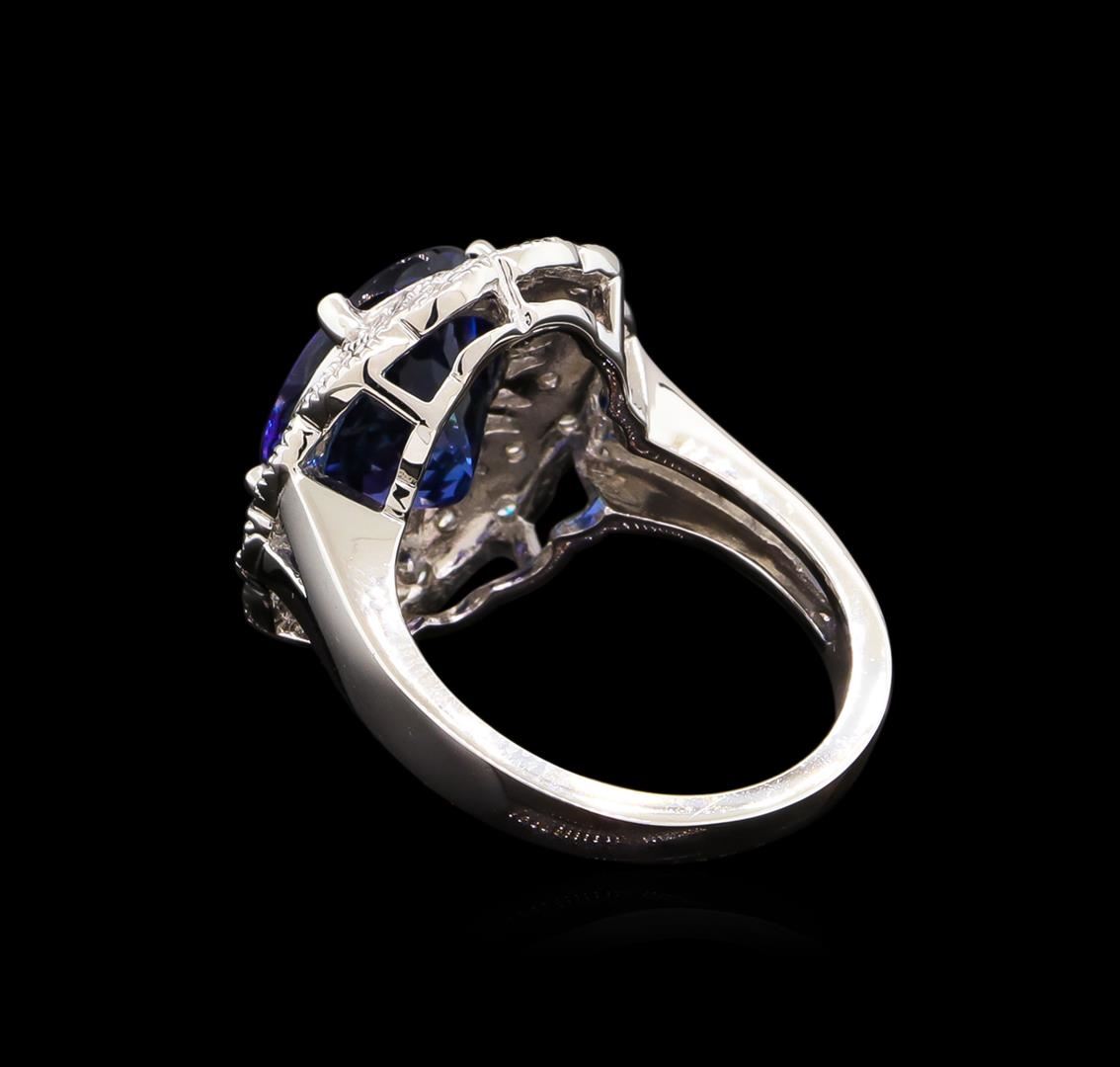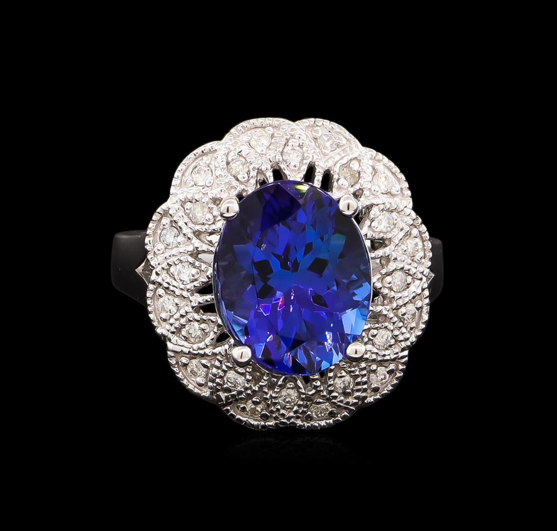 One electronically tested 14KT white gold lady's cast fashion ring with a scalloped basket halo with a bright polish with milgrain detailing finish. The featured lady's ring has a shank measuring 2.38 millimeters wide. Identified with markings of "14K". Condition is new, good workmanship. Containing: One prong set oval modified brilliant cut natural tanzanite, measuring 11.90 x 9.57 x 7.09mm, approximate weight of 5.20ct., clarity is eye clean, type I, medium dark, strong, violetish blue color, (GIA vB 6/5), cut is very good. Transmitting light with no distortion, transparent. Colored gemstones are presumed to have been subjected to commonly used enhancement processes. Graded in the setting. Twenty-Four prong set round brilliant cut diamonds, measuring 1.40 - 1.35 x 0.86mm (depth est.) approximate total weight of 24 Stones = 0.24ct. Graded in the setting. Clarity: SI-1 to SI-2. Color: G - I. Cut Good. Total Weight of Colored Stones 5.20ct. Total Weight of Diamonds 0.24ct. Total Weight of Ring 7.50gm. GAS Appraised at $10,715.00.