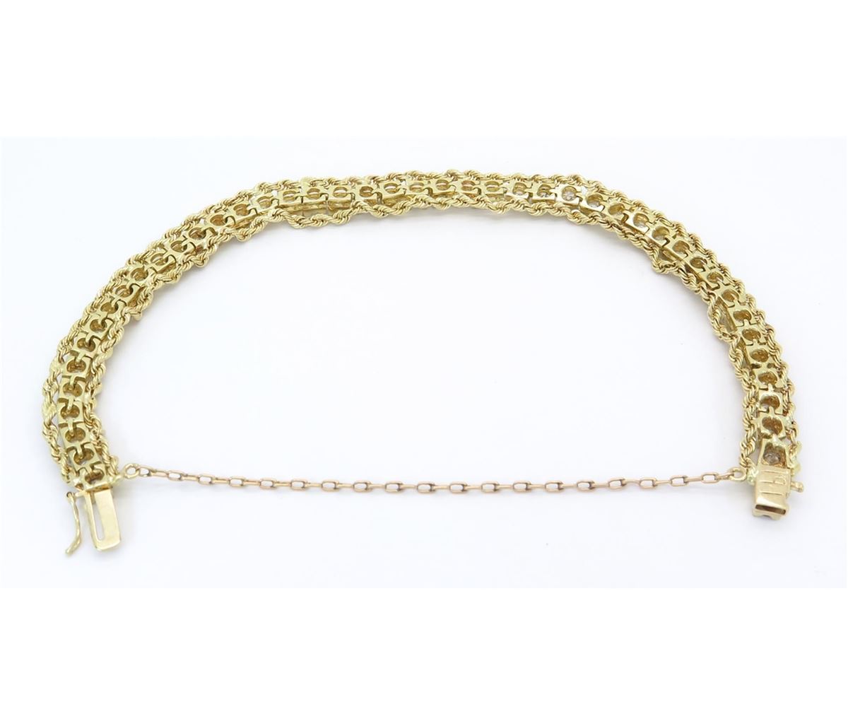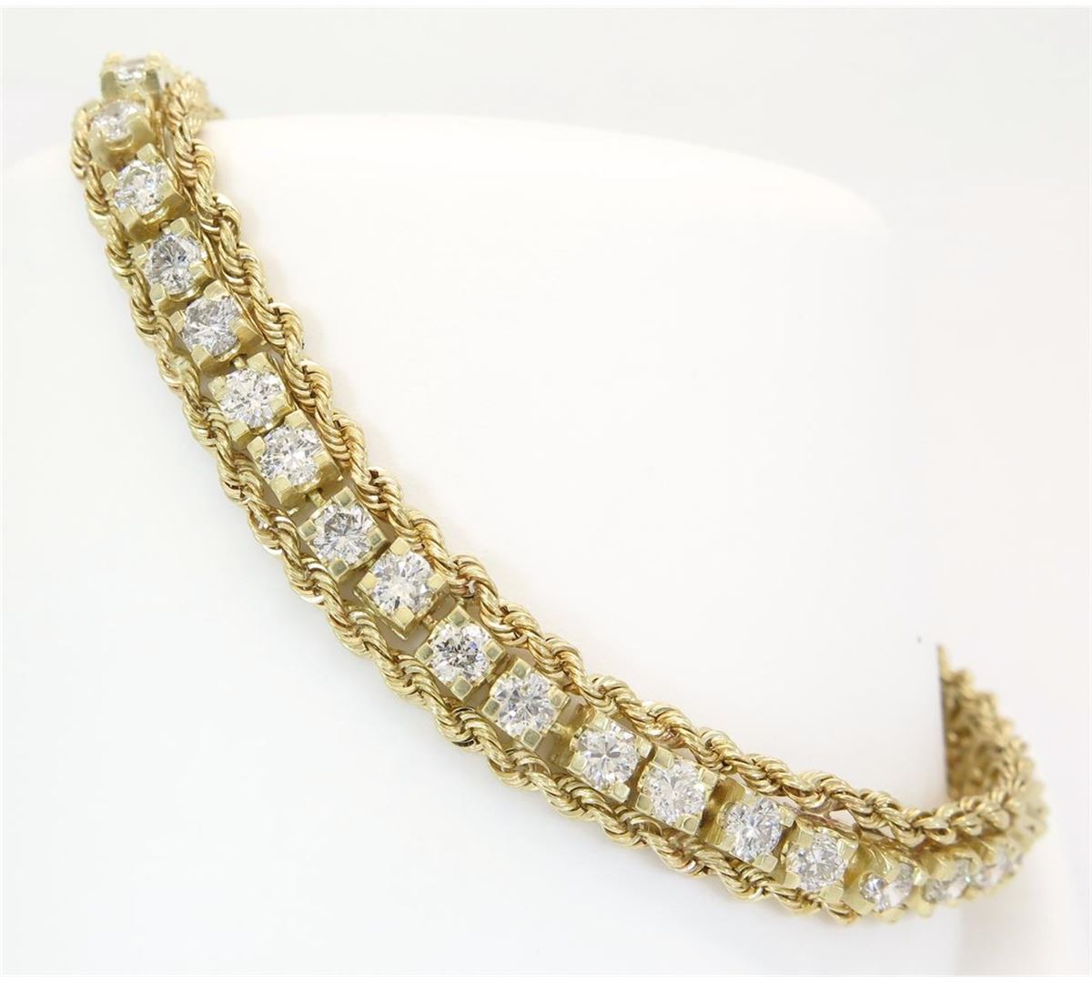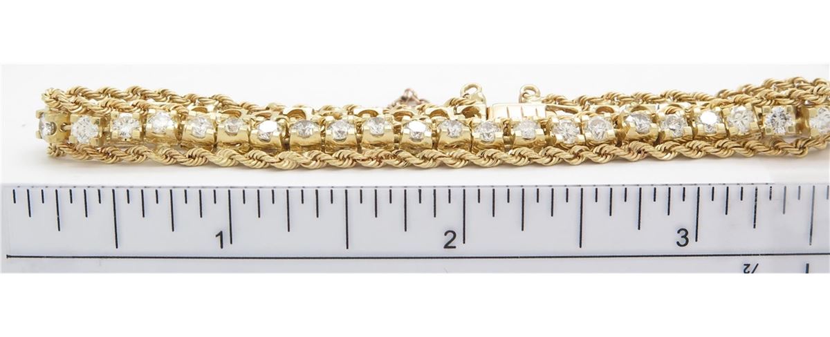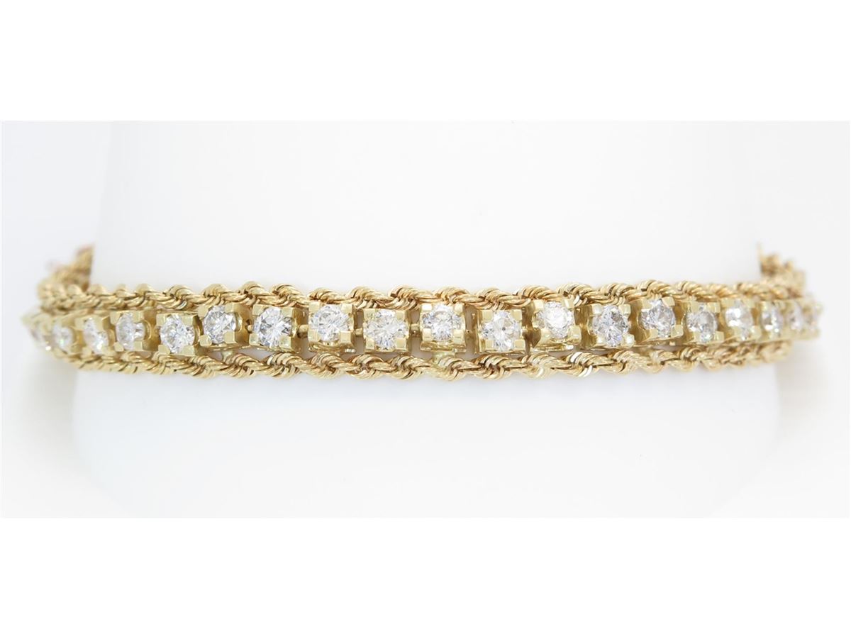 One tested 14K yellow gold diamond bracelet. Condition is new. Containing: 46 round Brilliant Cut Diamonds. Clarity: I-SI, Color: G-I. Approximate Total diamond weight: 5.22CTW. Diamonds are graded in the mounting, unless otherwise stated. Weight of bracelet: 18.6 grams. Size: 7.5"