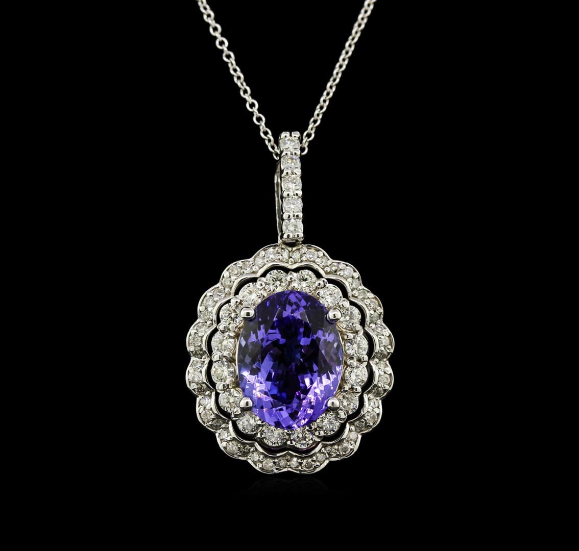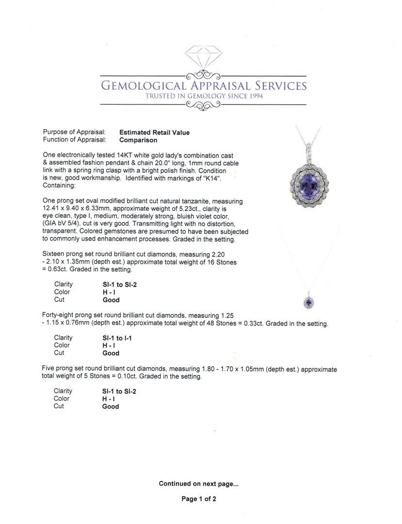 One electronically tested 14KT white gold lady's combination cast & assembled fashion pendant & chain 20.0" long, 1mm round cable link with a spring ring clasp with a bright polish finish. Identified with markings of "K14". Condition is new, good workmanship. Containing: One prong set oval modified brilliant cut natural tanzanite, measuring 12.41 x 9.40 x 6.33mm, approximate weight of 5.23ct., clarity is eye clean, type I, medium, moderately strong, bluish violet color, (GIA bV 5/4), cut is very good. Transmitting light with no distortion, transparent. Colored gemstones are presumed to have been subjected to commonly used enhancement processes. Graded in the setting. Sixteen prong set round brilliant cut diamonds, measuring 2.20 - 2.10 x 1.35mm (depth est.) approximate total weight of 16 Stones = 0.63ct. Graded in the setting. Clarity: SI-1 to SI-2. Color: H - I. Cut Good Forty-Eight prong set round brilliant cut diamonds, measuring 1.25 - 1.15 x 0.76mm (depth est.) approximate total weight of 48 Stones = 0.33ct. Graded in the setting. Clarity: SI-1 to I-1. Color: H - I. Cut Good Five prong set round brilliant cut diamonds, measuring 1.80 - 1.70 x 1.05mm (depth est.) approximate total weight of 5 Stones = 0.10ct. Graded in the setting. Clarity: SI-1 to SI-2. Color: H - I. Cut Good. Total Weight of Colored Stones 5.23ct. Total Weight of Diamonds 1.06ct. Total Weight of Pendant & Chain 7.40gm. GAS Appraised at $11,750.00.