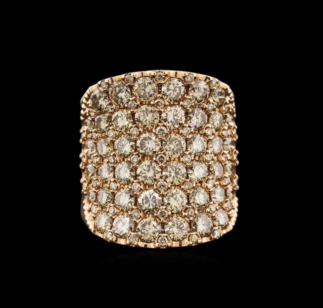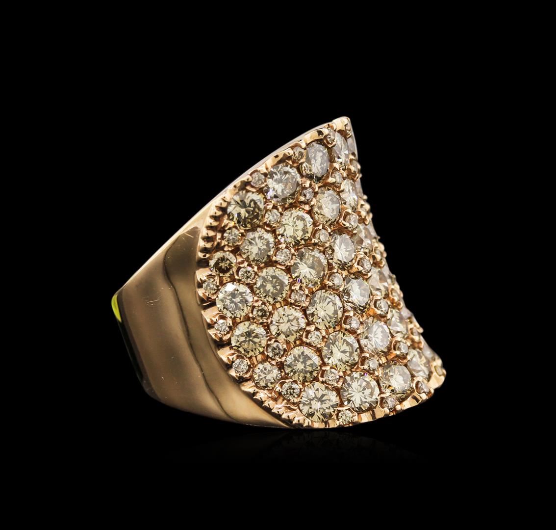 One electronically tested 14KT rose gold lady's cast fashion ring with tapered shank with a bright polish finish. Condition is new. Identified with markings of "14K". Containing: Forty-four prong set round brilliant cut diamonds, measuring 3.25 - 2.90 x 1.85mm (depth est.) approximate total weight of 44 Stones = 4.74ct. Colored gemstones are presumed to have been subjected to commonly used enhancement processes. Graded in the setting. Clarity: VS-2 to SI-2. Color: Fancy Greenish Yellow. Cut: Good. Fifty-one prong set round brilliant cut diamonds, measuring 1.40 - 1.30 x 0.81 (depth est.) approximate total weight of 51 Stones = 0.50ct. Colored gemstones are presumed to have been subjected to commonly used enhancement processes. Graded in the setting. Clarity: SI-1 to SI-2. Color: Fancy Light-Greenish Yellow. Cut: Good. Total Weight of Diamonds: 5.24ct. Total Weight of Ring: 14.10 gm. GAS Appraised at $16,800.00.
