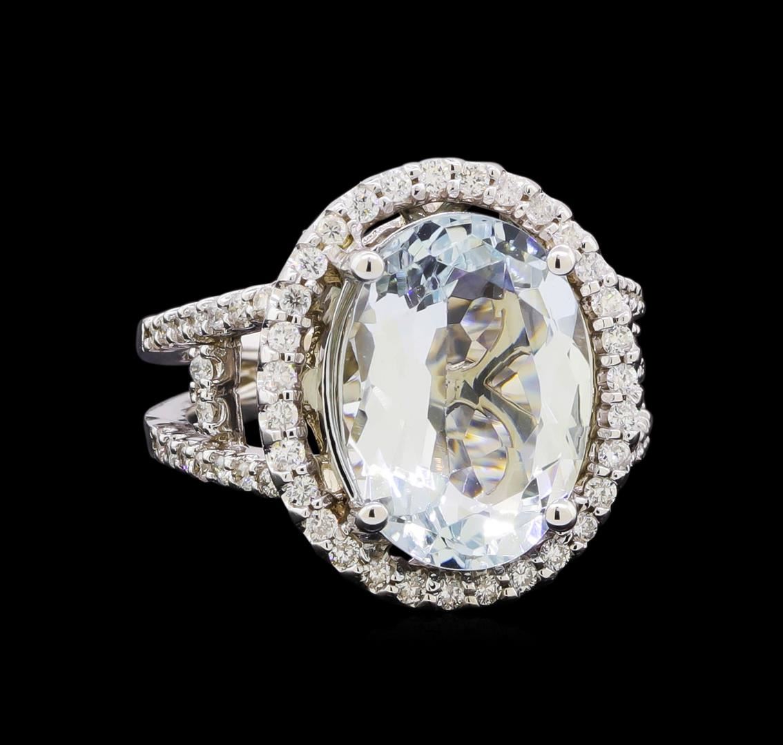 One electronically tested 14KT white gold lady's cast fashion halo ring with a split shank with a bright polish finish. Featured lady's ring has a shank measuring 3.55 millimeters in length. Identified with markings of "14K". Condition is new, good workmanship. Containing: One prong set oval modified brilliant cut natural aquamarine, measuring 14.00 x 10.10 x 6.61mm, (depth est.) approximate weight of 5.25ct., clarity is eye clean, light, very slightly grayish, blue color, (GIA B 3/3), cut is very good. Transmitting light with no distortion, transparent. Colored gemstones are presumed to have been subjected to commonly used enhancement processes. Graded in the setting. Sixty-Four prong set round brilliant cut diamonds, measuring 1.35 - 1.25 x 0.81mm (depth est.) approximate total weight of 64 Stones = 0.55ct. Graded in the setting. Clarity: SI-1 to SI-2. Color: G - Good. Total Weight of Colored Stones 5.25ct. Total Weight of Diamonds 0.55ct. Total Weight of Ring 8.20gm. GAS Appraised at $7,320.00.