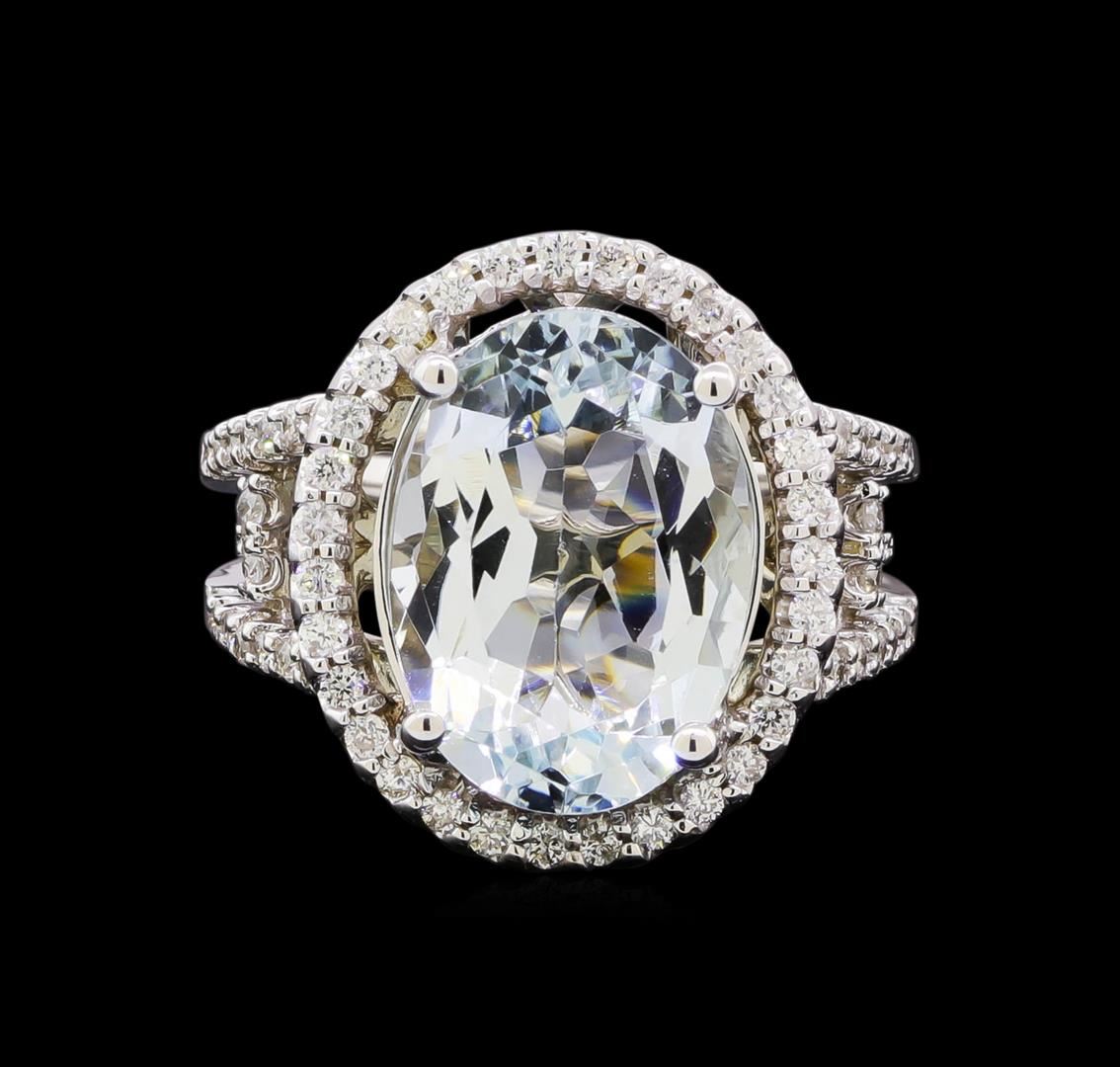 One electronically tested 14KT white gold lady's cast fashion halo ring with a split shank with a bright polish finish. Featured lady's ring has a shank measuring 3.55 millimeters in length. Identified with markings of "14K". Condition is new, good workmanship. Containing: One prong set oval modified brilliant cut natural aquamarine, measuring 14.00 x 10.10 x 6.61mm, (depth est.) approximate weight of 5.25ct., clarity is eye clean, light, very slightly grayish, blue color, (GIA B 3/3), cut is very good. Transmitting light with no distortion, transparent. Colored gemstones are presumed to have been subjected to commonly used enhancement processes. Graded in the setting. Sixty-Four prong set round brilliant cut diamonds, measuring 1.35 - 1.25 x 0.81mm (depth est.) approximate total weight of 64 Stones = 0.55ct. Graded in the setting. Clarity: SI-1 to SI-2. Color: G - Good. Total Weight of Colored Stones 5.25ct. Total Weight of Diamonds 0.55ct. Total Weight of Ring 8.20gm. GAS Appraised at $7,320.00.