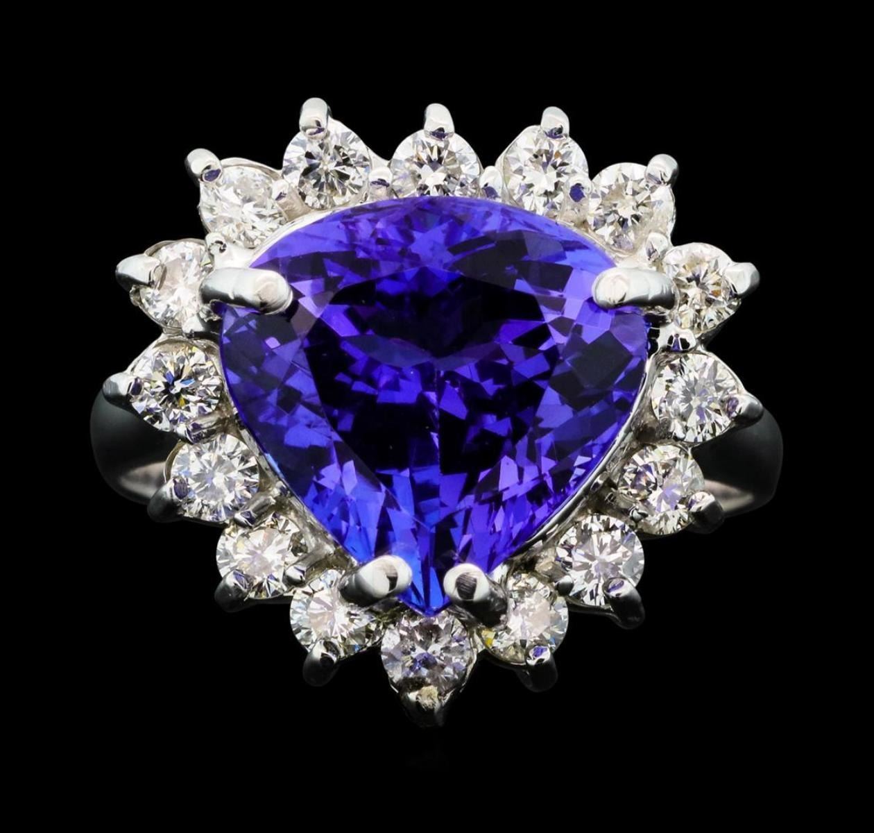 One electronically tested 14KT white gold lady's cast fashion ring with a basket halo with a bright polish finish. The featured lady's ring has a shank measuring 2.91 millimeters wide. Identified with markings of 'K14'. Condition is new, good workmanship. Containing: One prong set pear modified brilliant cut natural tanzanite, measuring 10.91 x 11.11 x 6.84mm, (depth est.) approximate weight of 5.25ct., clarity is eye clean, medium dark, moderately strong, violetish blue color, (GIA vB 6/4), cut is very good. Transmitting light with no distortion, transparent. Colored gemstones are presumed to have been subjected to commonly used enhancement processes. Graded in the setting. Sixteen prong set round brilliant cut diamonds, measuring 2.40 - 2.30 x 1.46mm (depth est.) approximate total weight of 16 Stones = 0.80ct. Graded in the setting. Color H - I Clarity SI-1 to SI-2 Cut Good. Total Weight of Colored Stones 5.25ct.. Total Weight of Diamonds 0.80ct.. Total Weight of Ring 6.30gm. GAS Appraised.
