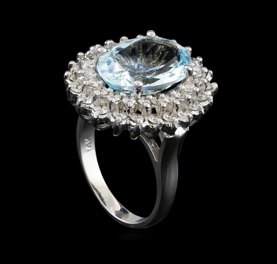 One electronically tested 14KT white gold lady's cast fashion ring with a double basket halo with a bright polish finish. The featured lady's ring has a shank measuring 2.35 millimeters wide. Identified with markings of "14K". Condition is new, good workmanship. Containing: One prong set oval modified brilliant cut natural aquamarine, measuring 14.15 x 10.11 x 6.26mm, 3%. bulge factor, approximate weight of 5.26ct., clarity is slightly included, type I, light, very slightly grayish, very slightly greenish blue color, (GIA vslgB 3/3), cut is good. Transmitting light with a minimum of distortion, transparent. Colored gemstones are presumed to have been subjected to commonly used enhancement processes. Graded in the setting. Twenty-Two prong set round brilliant cut diamonds, measuring 2.15 - 2.05 x 1.26mm (depth est.) approximate total weight of 22 Stones = 0.75ct. Graded in the setting. Clarity: SI-1 to SI-2. Color: H - I. Cut Very Good Twenty-Two prong set round brilliant cut diamonds, measuring 1.90 - 1.80 x 1.15mm (depth est.) approximate total weight of 22 Stones = 0.55ct. Graded in the setting. Clarity: VS-2 to SI-2. Color: H - I. Cut Very Good. Total Weight of Colored Stones 5.26ct. Total Weight of Diamonds 1.30ct. Total Weight of Ring 8.40gm GAS Appraised at $8,975.00.