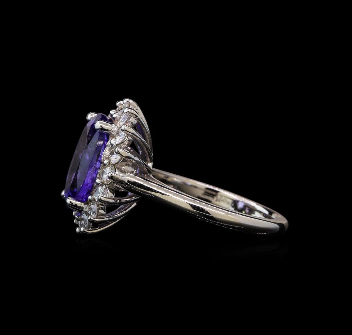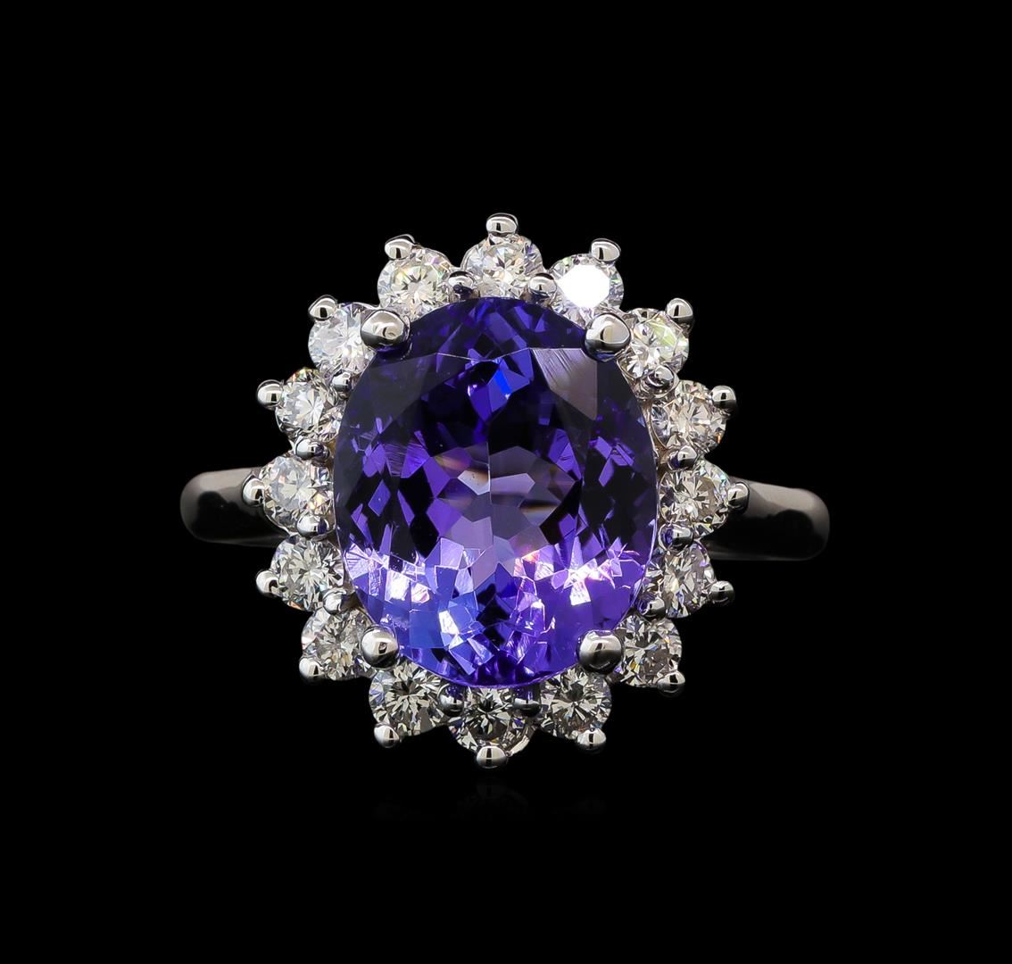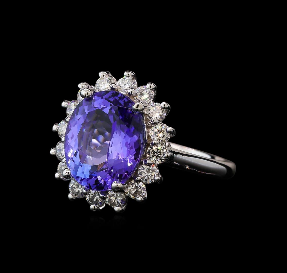 One electronically tested 14KT white gold lady's cast fashion ring with a basket halo with a bright polish finish. The featured lady's ring has a shank measuring 2.21 millimeters wide. Identified with markings of '14K'. Condition is new, good workmanship. Containing: One prong set oval modified brilliant cut natural tanzanite, measuring 12.12 x 10.06 x 5.87mm, (depth est.) 5%. bulge factor, approximate weight of 5.27ct., clarity is eye clean, medium, moderately strong, bluish violet color, (GIA bV 5/4), cut is very good. Transmitting light with no distortion, transparent. Colored gemstones are presumed to have been subjected to commonly used enhancement processes. Graded in the setting. Sixteen prong set round brilliant cut diamonds, measuring 2.50 - 2.40 x 1.49mm (depth est.) approximate total weight of 16 Stones = 0.88ct. Graded in the setting. Clarity SI-1 to SI-2. Color: H - I Cut Good. Total Weight of Colored Stones 5.27ct.. Total Weight of Diamonds 0.88ct.. Total Weight of Ring 6.30gm GAS Appraised at $11,045.00.