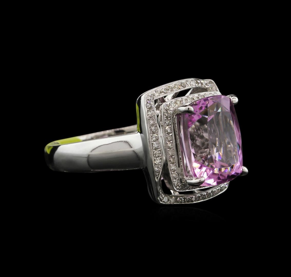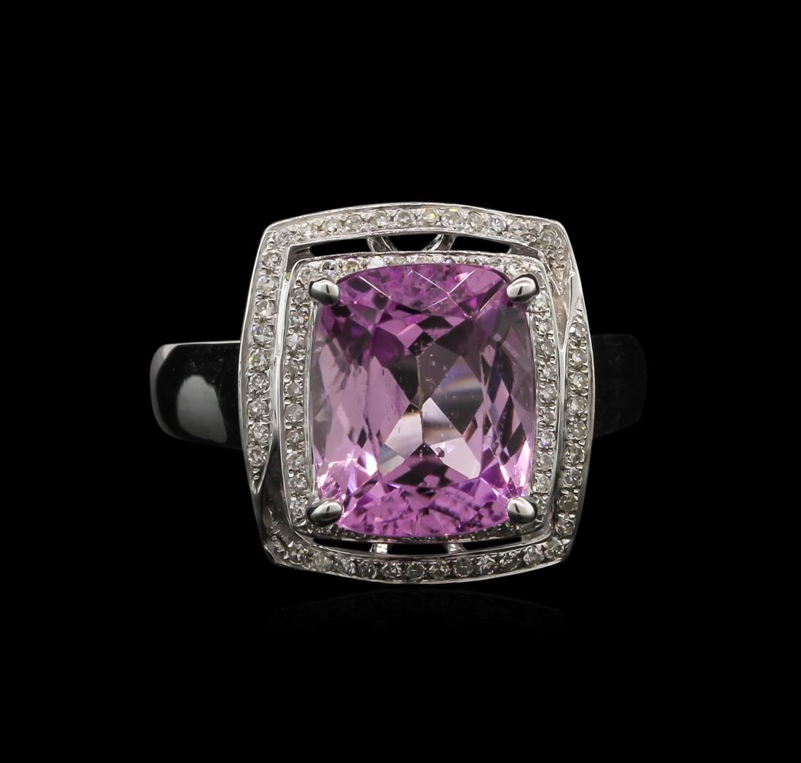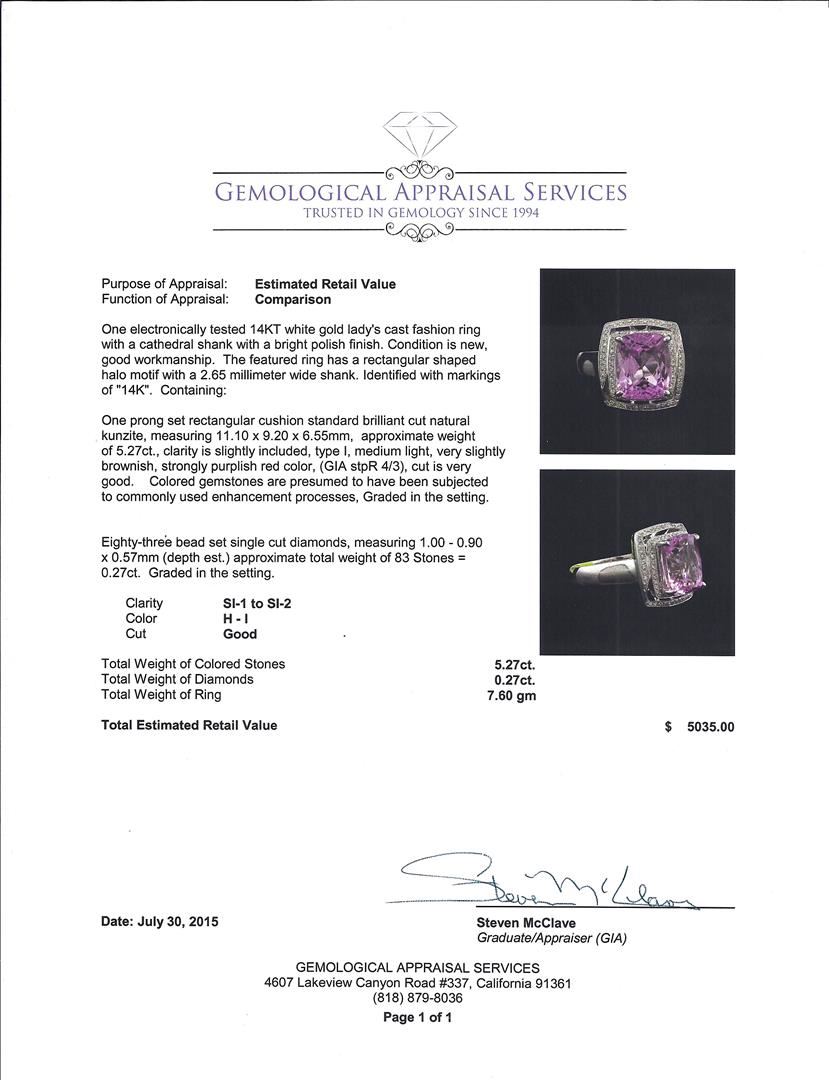 One electronically tested 14KT white gold lady's cast fashion ring with a cathedral shank with a bright polish finish. The featured ring has a rectangular shaped halo motif with a 2.65 millimeter wide shank. Identified with markings of "14K". Condition is new, good workmanship. Containing: One prong set rectangular cushion standard brilliant cut natural kunzite, measuring 11.10 x 9.20 x 6.55mm, approximate weight of 5.27ct., clarity is slightly included, type I, medium light, very slightly brownish, strongly purplish red color, (GIA stpR 4/3), cut is very good. Colored gemstones are presumed to have been subjected to commonly used enhancement processes, Graded in the setting. Eighty-Three bead set single cut diamonds, measuring 1.00 - 0.90 x 0.57mm (depth est.) approximate. Total Weight of 83 Stones = 0.27ct. Graded in the setting. Clarity: SI-1 to SI-2. Color: H - I. Cut Good. Total Weight of Colored Stones 5.27ct. Total Weight of Diamonds 0.27ct. Total Weight of Ring 7.60gm. GAS Appraised at $5,035.00.