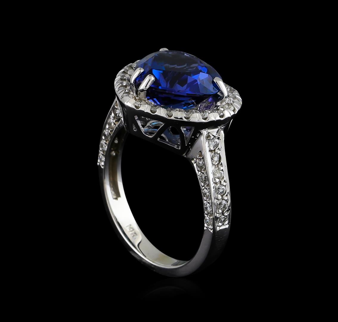 One electronically tested 14KT white gold ladies cast tanzanite and diamond ring with a bright polish finish. The featured tanzanite is set within a diamond bezel supported by an elaborate lattice under gallery and diamond set shoulders, completed by a two millimeter wide band. Identified with markings of "14K". Condition is new, good workmanship. Containing: One prong set heart mixed cut natural tanzanite, measuring 10.00 x 10.50 x 7.70mm, approximate weight of 5.28ct., clarity is eye clean, type I, dark, moderately strong, violetish blue color, (GIA vB 7/4), cut is good. Transmitting light with no distortion, transparent. Colored Stone Grading Report attached. Graded in the setting. Tanzanite is a very rare gemstone that is only found in the country of Tanzania. Originally discovered in 1967. Tiffany & Company, named the stone Tanzanite. It is found in the Usumburu Mountains that border the Umba Valley of northern Tanzania. Tanzanite occurs in gray, brown, violet, blue, reddish-purple, & green. The gem is interesting because of its exceptional pleochroism. Rotated in different directions a tanzanite will exhibit multiple changes of color. Tanzanite has a low tolerance to ultrasonic cleaning, and should not be cleaned using this method. Twenty-Two prong set round brilliant cut diamonds, measuring 1.50 - 1.50 x 0.90mm (depth est.) approximate total weight of 22 Stones = 0.27ct. Graded in the setting. Clarity: SI-2 to I-2. Color: G - I Thirty-Two prong set round brilliant cut diamonds, measuring 1.30 - 1.20 x 0.75mm (depth est.) approximate total weight of 32 Stones = 0.23ct. Graded in the setting. Clarity: SI-2 to I-2. Color: G - I. Total Weight of Colored Stones 5.28ct. Total Weight of Diamonds 0.50ct. Total Weight of Ring 5.14gm. AIG Appraised at $14,010.00.